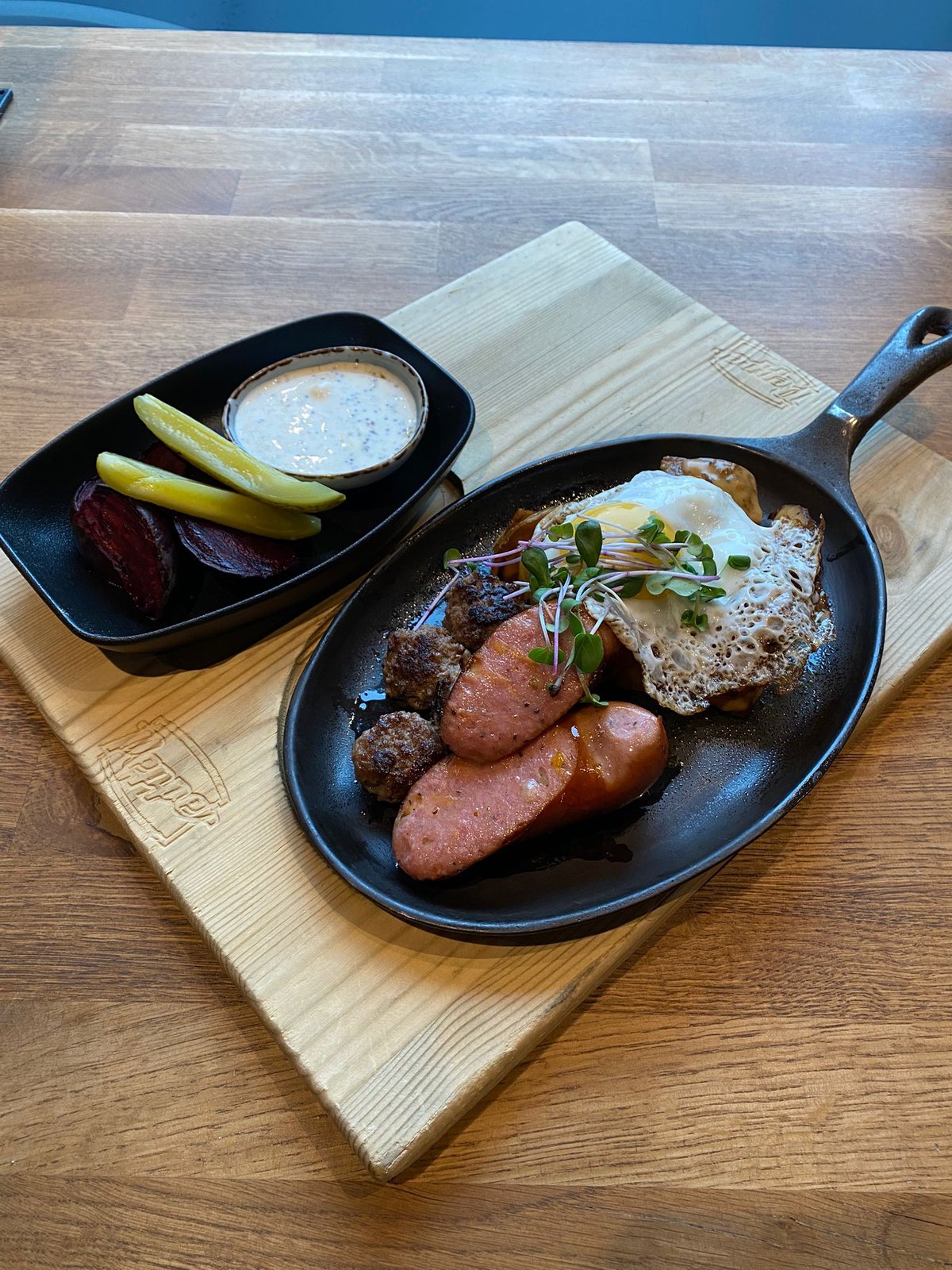 Huberin Huilu -makkaraa, lihapullia, pippurikermassa paistettua perunaa, punajuurta sekä maustekurkkua. Annoksen kruunaa häränsilmäksi paistettu kananmuna ja ryytisinappi.
