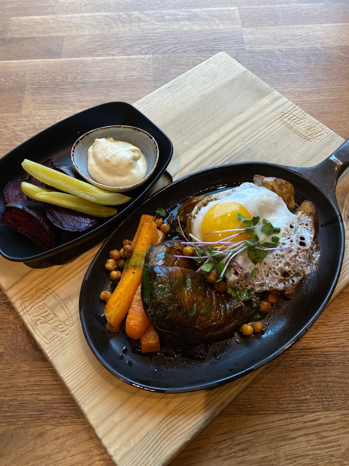 Paistettua portobelloa, pippurikermassa paahdettua perunaa, häränsilmäksi paistettu kananmuna, rapeita kikherneitä, paahdettua porkkanaa, punajuurta, maustekurkkua sekö valkosipulidippi.