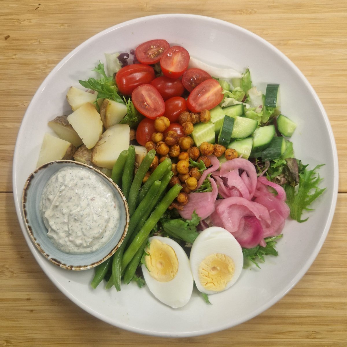 Raikasta salaattisekoitusta, mehukasta tomaattia ja kurkkua, marinoitua punasipulia, papuja, kananmunaa sekä paahdettua perunaa. Lisäksi chimichurri-jugurttia ja rapeita kikherneitä.