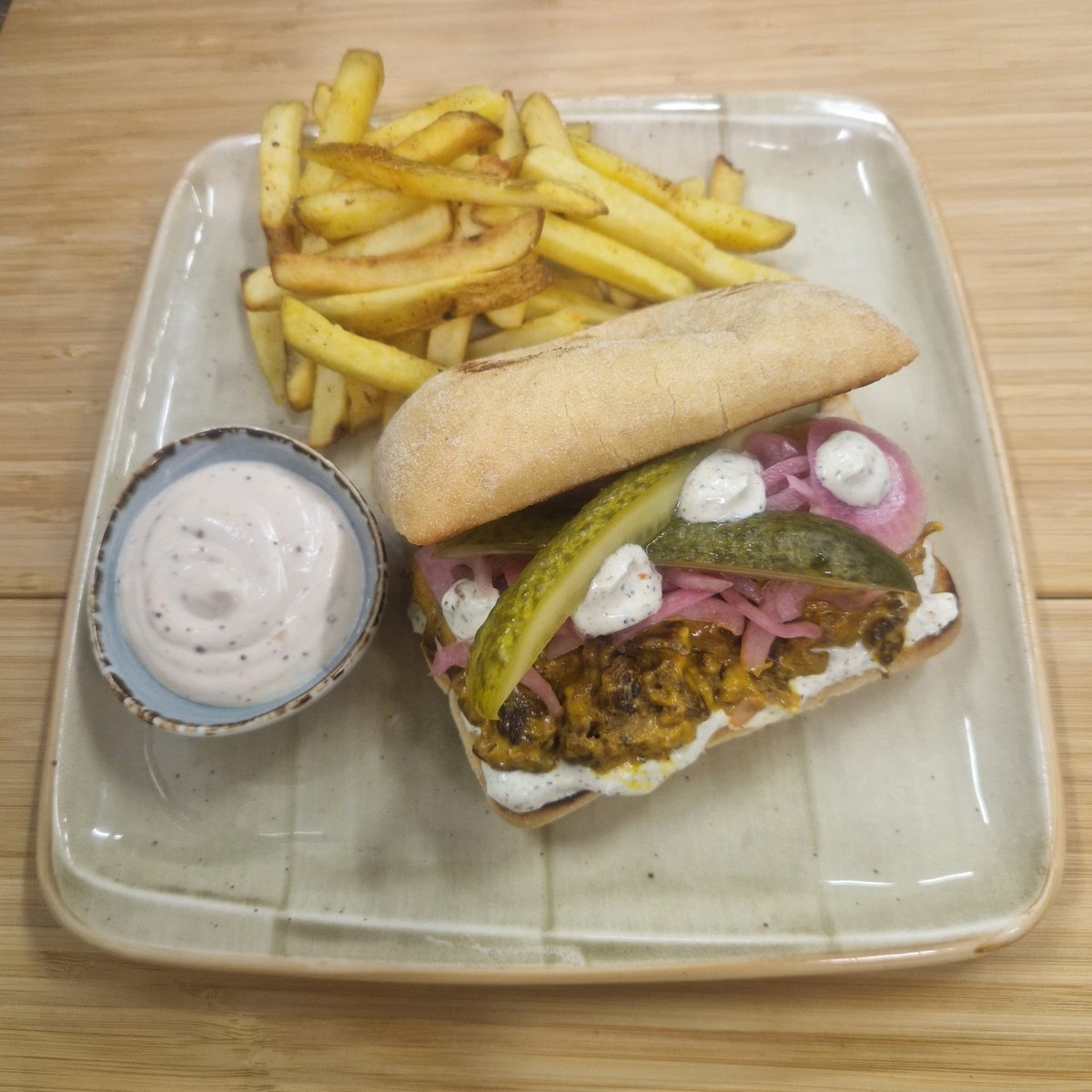 Ciabatta leivän välissä ylikypsää härän niskaa, Café de Paris -kastiketta, marinoitua punasipulia sekä maustekurkkua. Tarjoillaan maustettujen maalaisranskanperunoiden ja talon ranch-dipin kera. *Kastike sisältää kalaa.