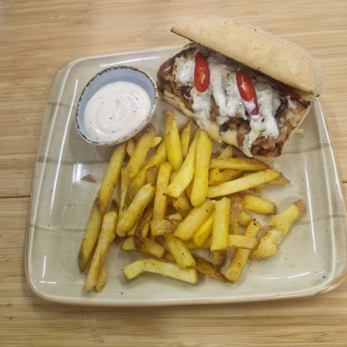 Paistettua broilerinfileetä, paprikaa ja punasipulia, rapeaa pekonia, smetanaa, sweet chili-kermaa ja maalaisranskanperunat.