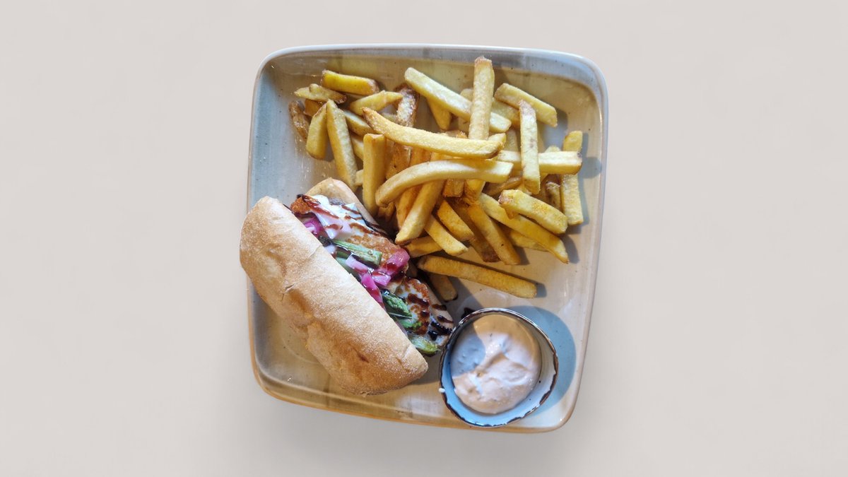 Ciabatta leivän välissä grillattua halloumia, raikasta chimichurri-jogurttia, marinoitua punasipulia ja papuja. Tarjoillaan maustettujen maalaisranskanperunoiden ja talon ranch-dipin kera.