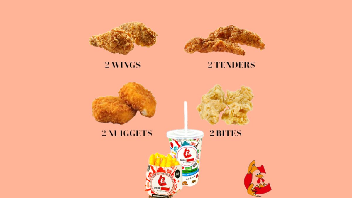 4 Tenders, 6 wings, 2 bites, 4 nuggets, 2 fries, 2 drink, 2 sauce