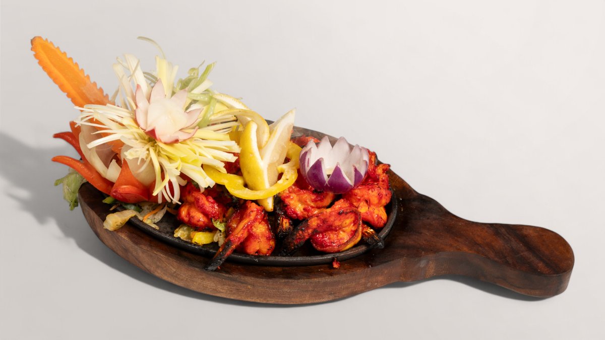 Cuisiné avec un mélange spécial de sauce vindaloo, de menthe, de jus de citron, de gingembre, d'ail et de diverses autres épices