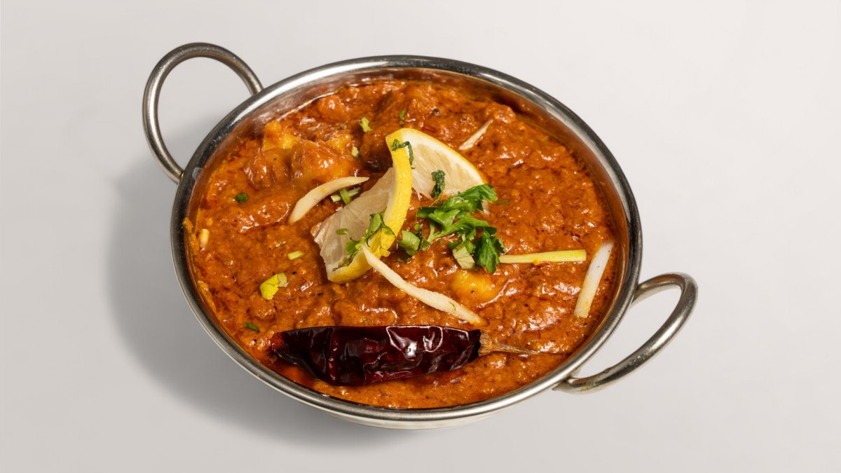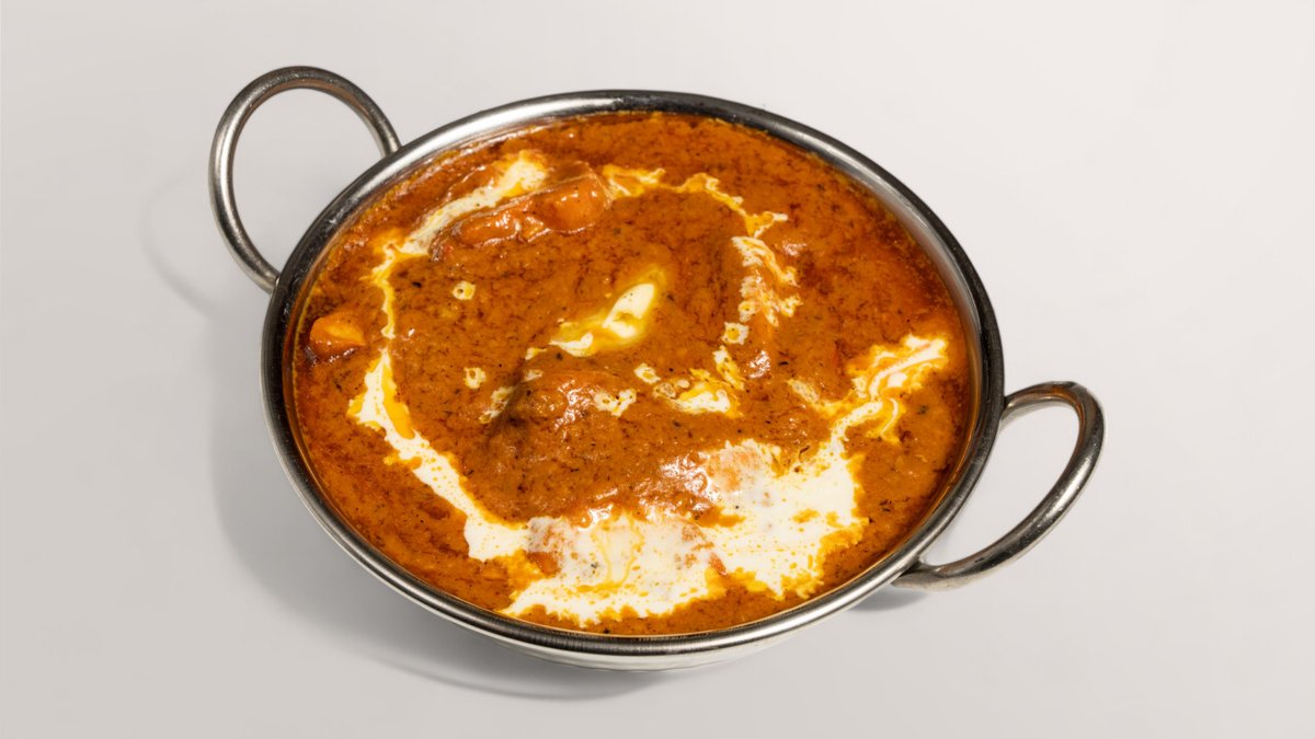 Cuit dans une sauce épaisse de beurre, d'oignons, de tomates avec du gingembre, de l'ail, de la crème et diverses épices indiennes