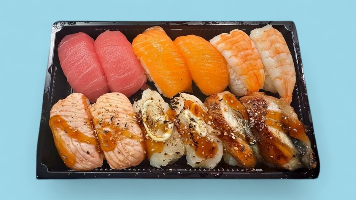 Riz vinaigré, 2 tranches de saumon, 2 tranches de thon, 2 pieces sushi ebi, 2 pieces anguilles et avocats