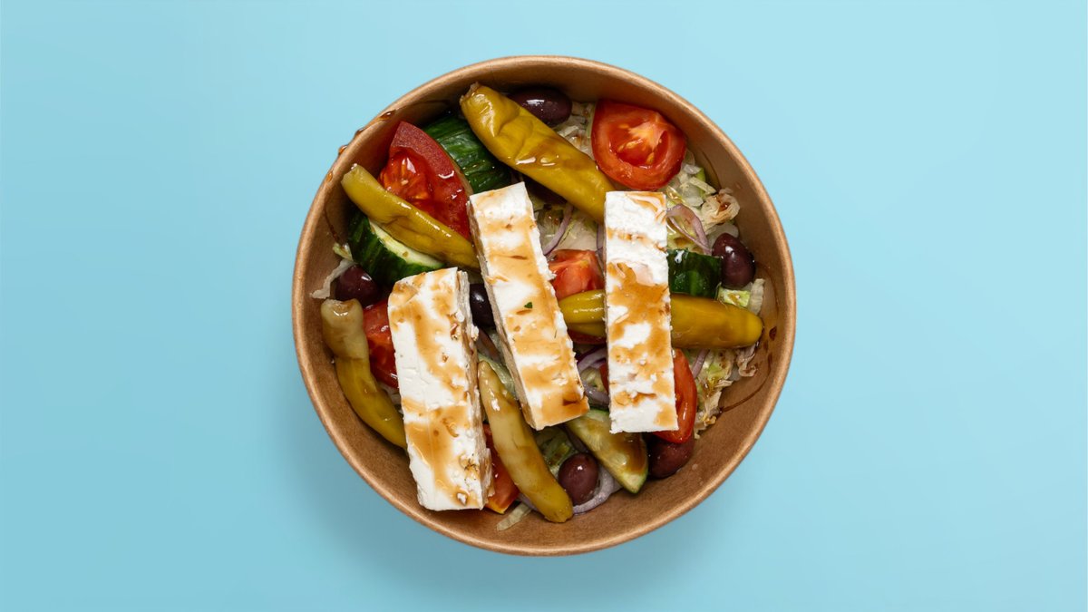 Tomate, concombre, salade mixte, olive, feta, poivrons, origan