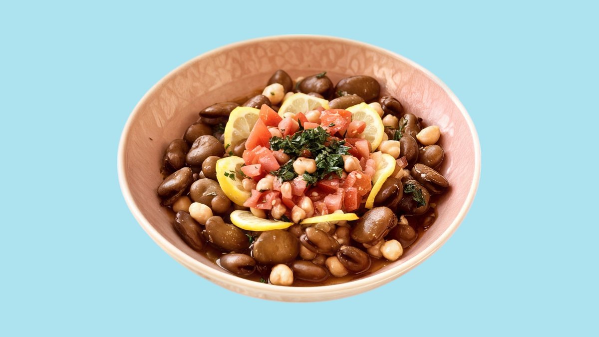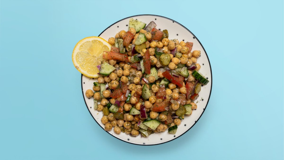 Pois chiche, concombre, tomate, poivrons rouge, cornichon