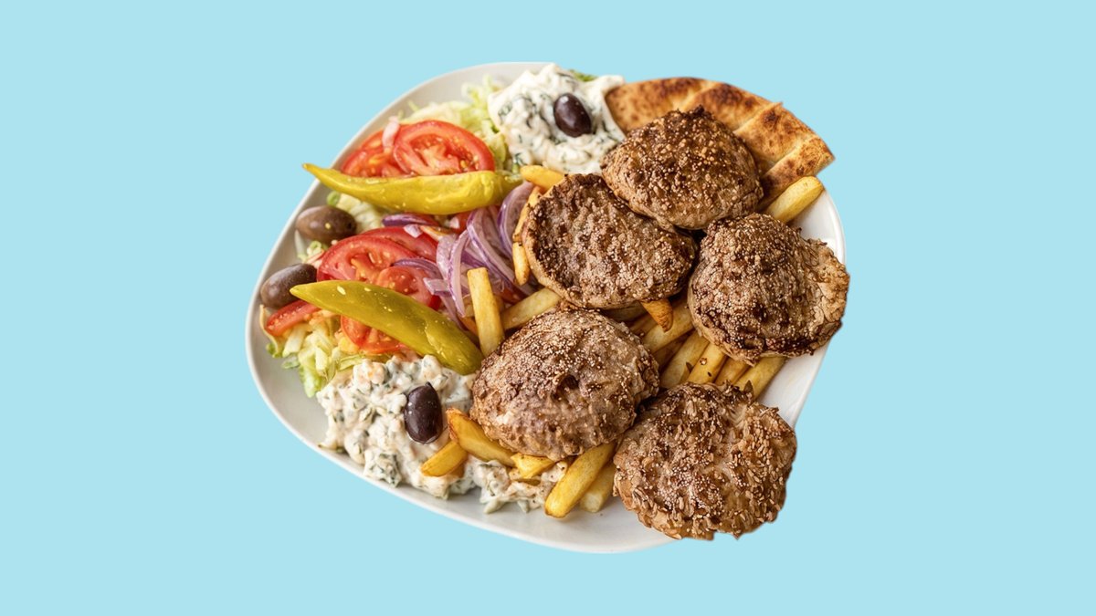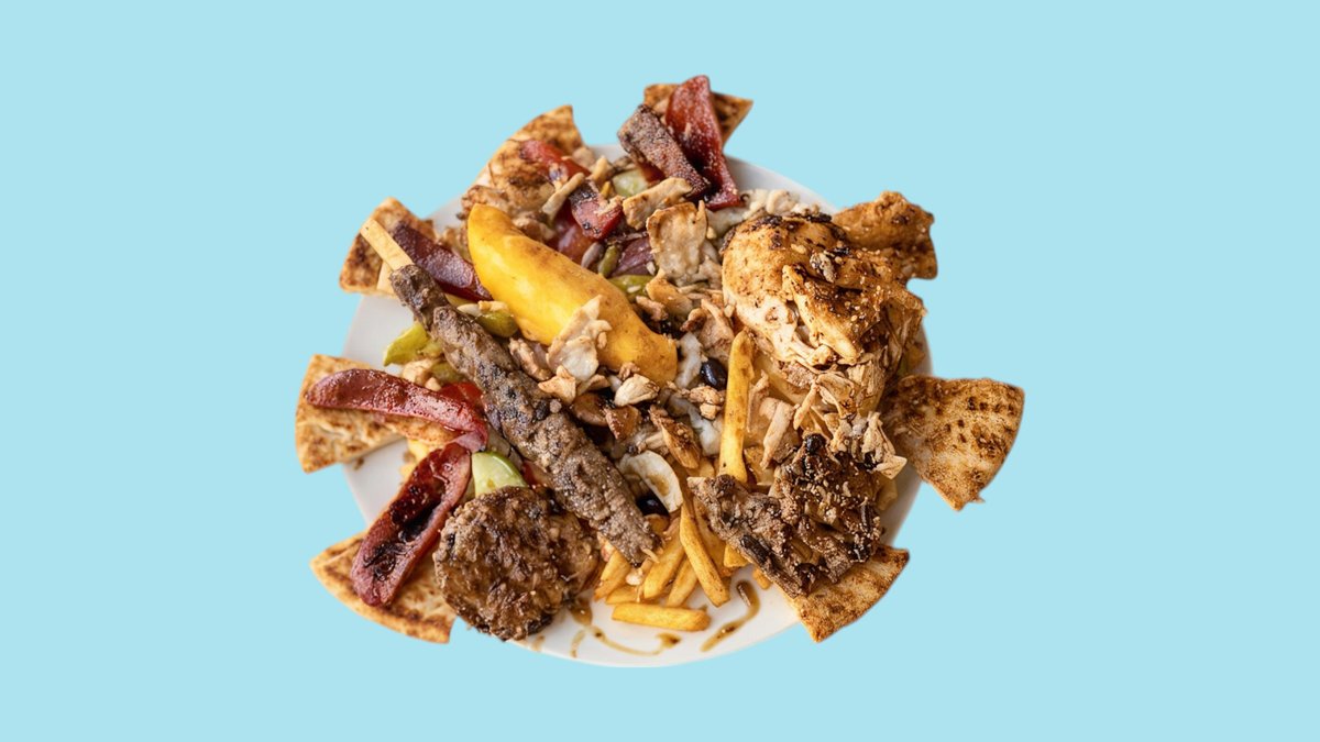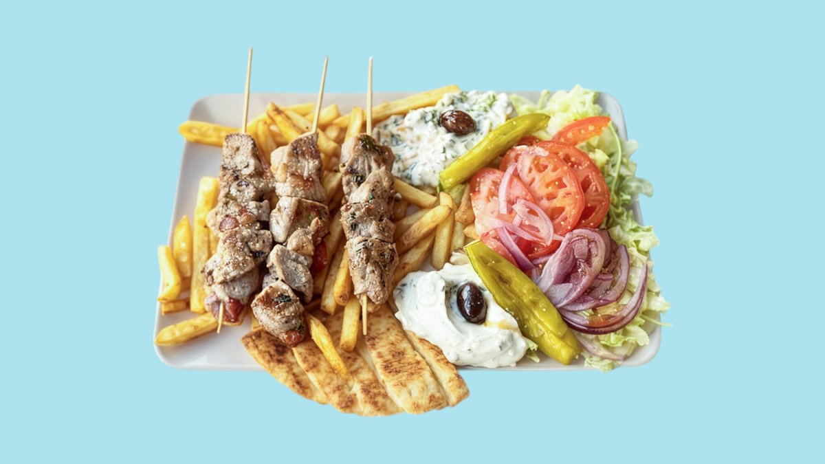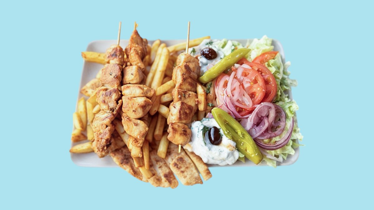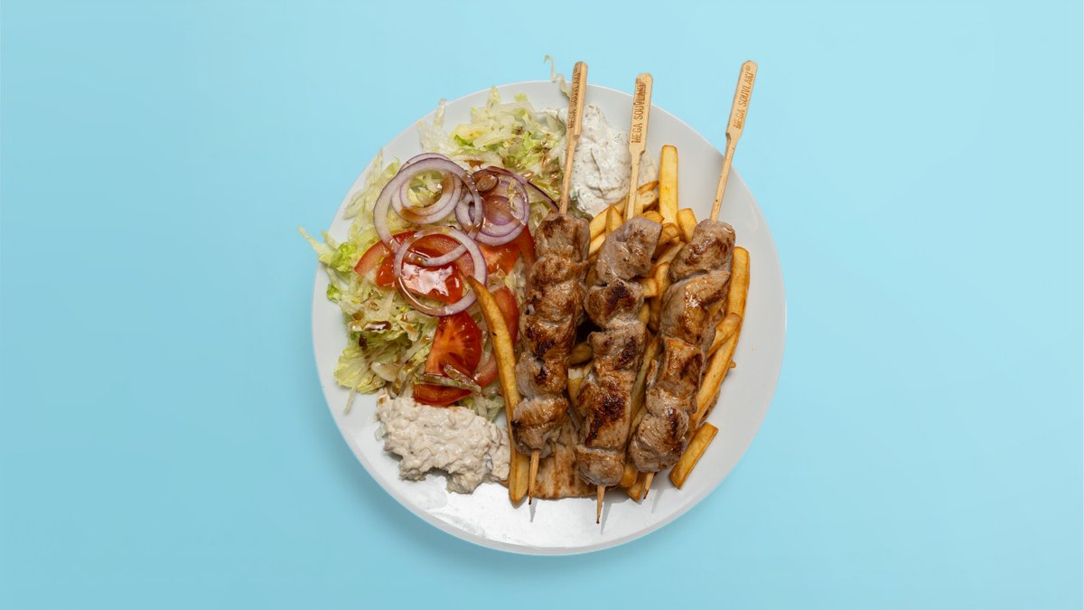 Brochette de poulet, brochette d’agneau, kofte, saucisse, salade, tomate, tsatsiki, frites