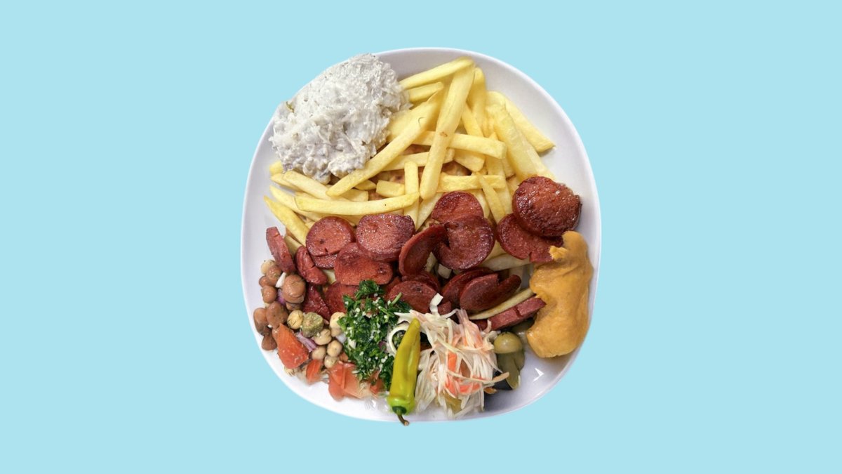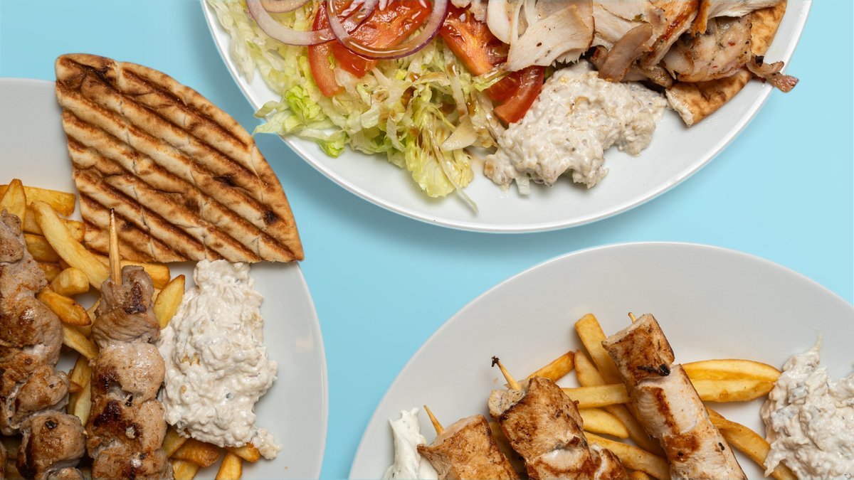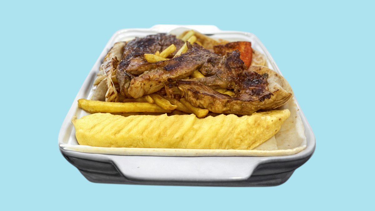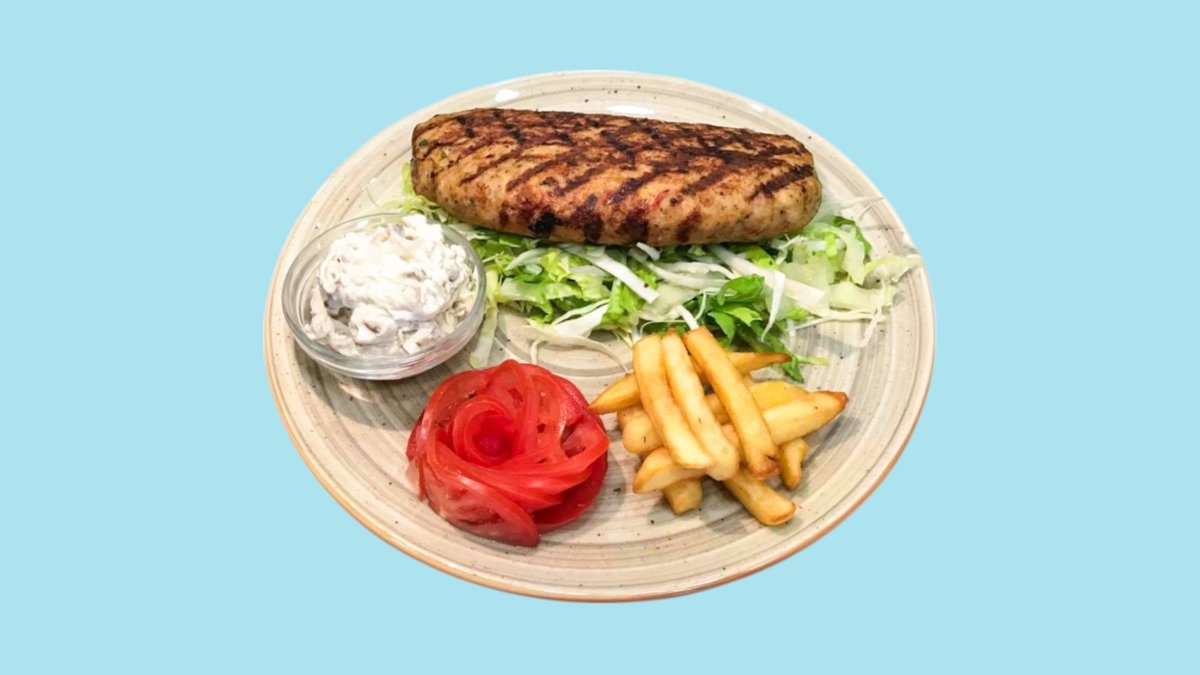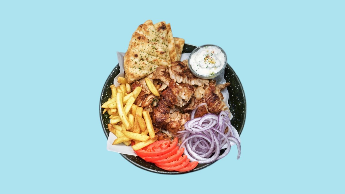 Brochette de poulet, brochette d’agneau, kofte, saucisse, salade, tomate, tsatsiki, frites