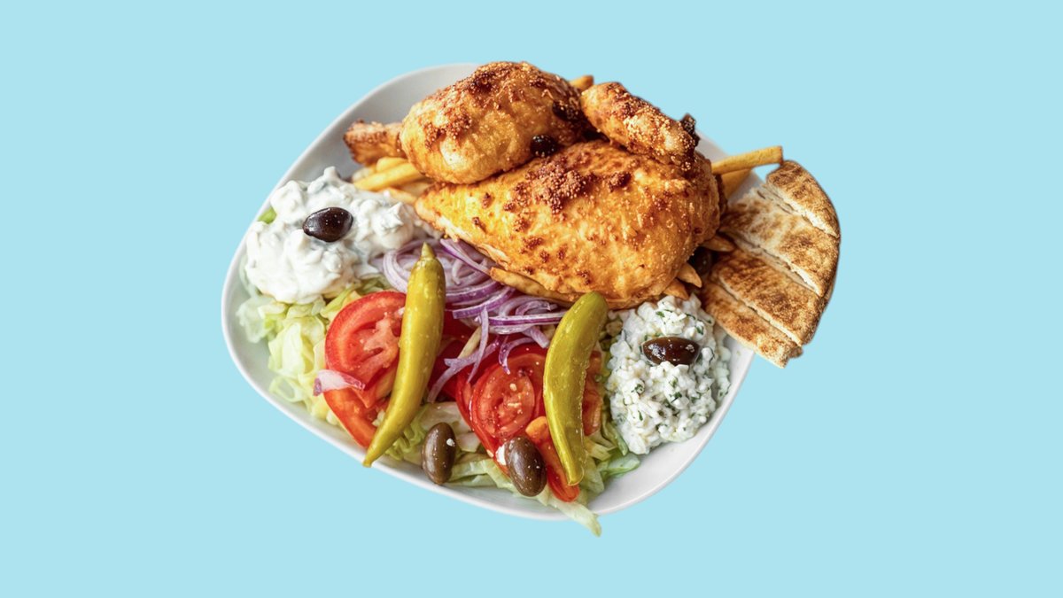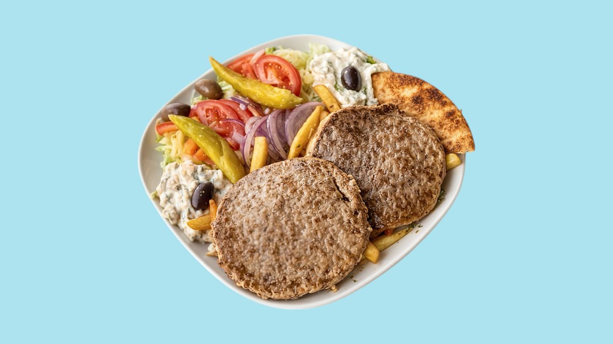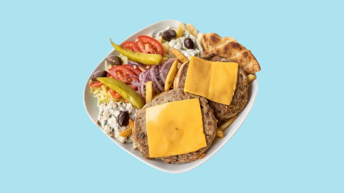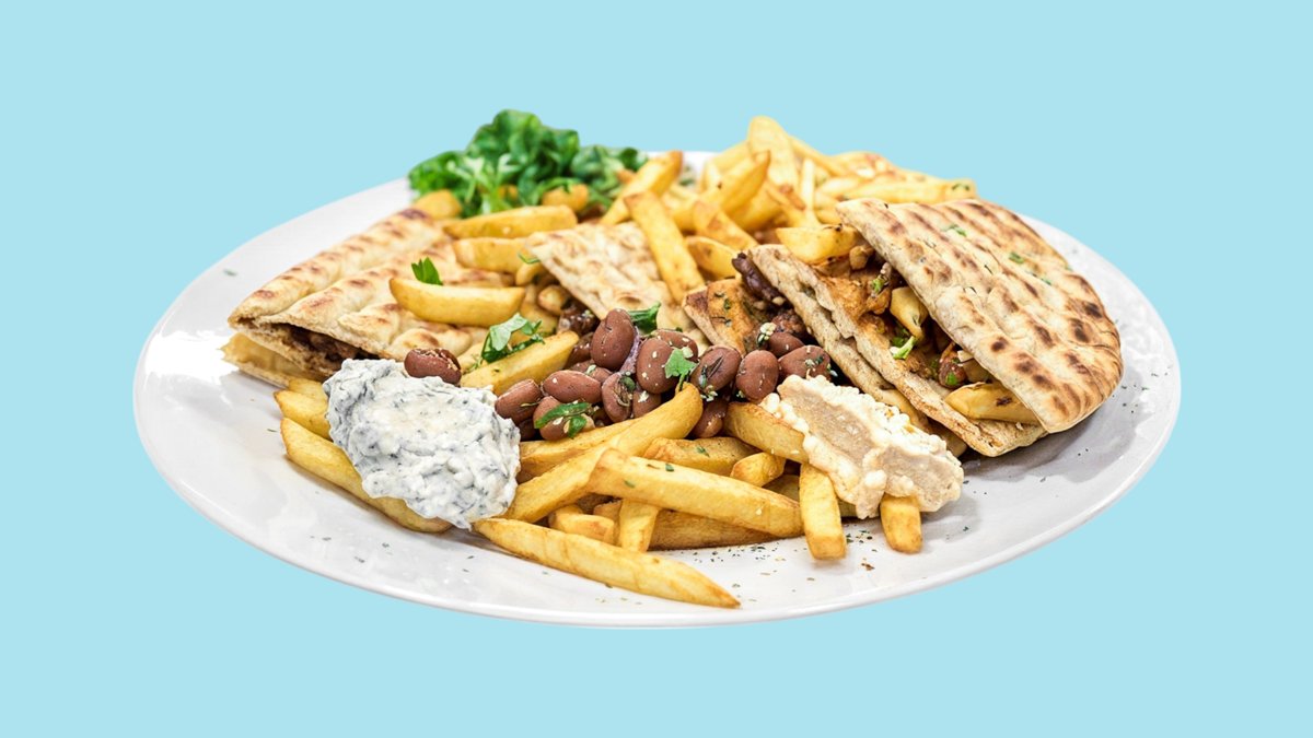 Feta, viande hachee de boeuf, salade, tomate, tsatsiki, frites, pain pita