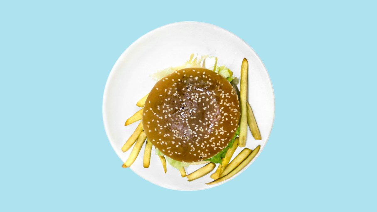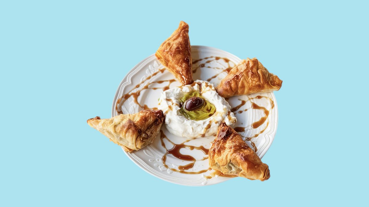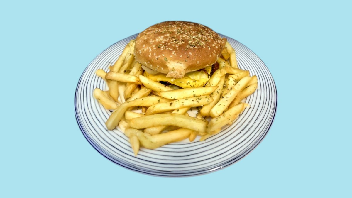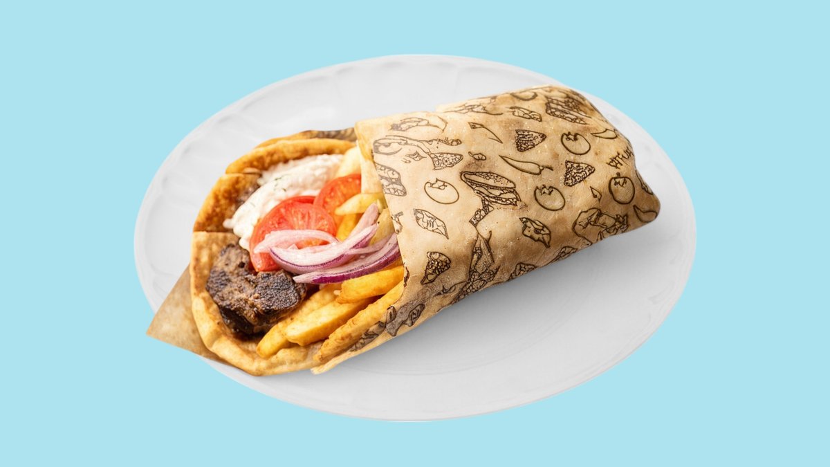 Feta, viande hachee de boeuf, salade, tomate, tsatsiki, frites, pain pita