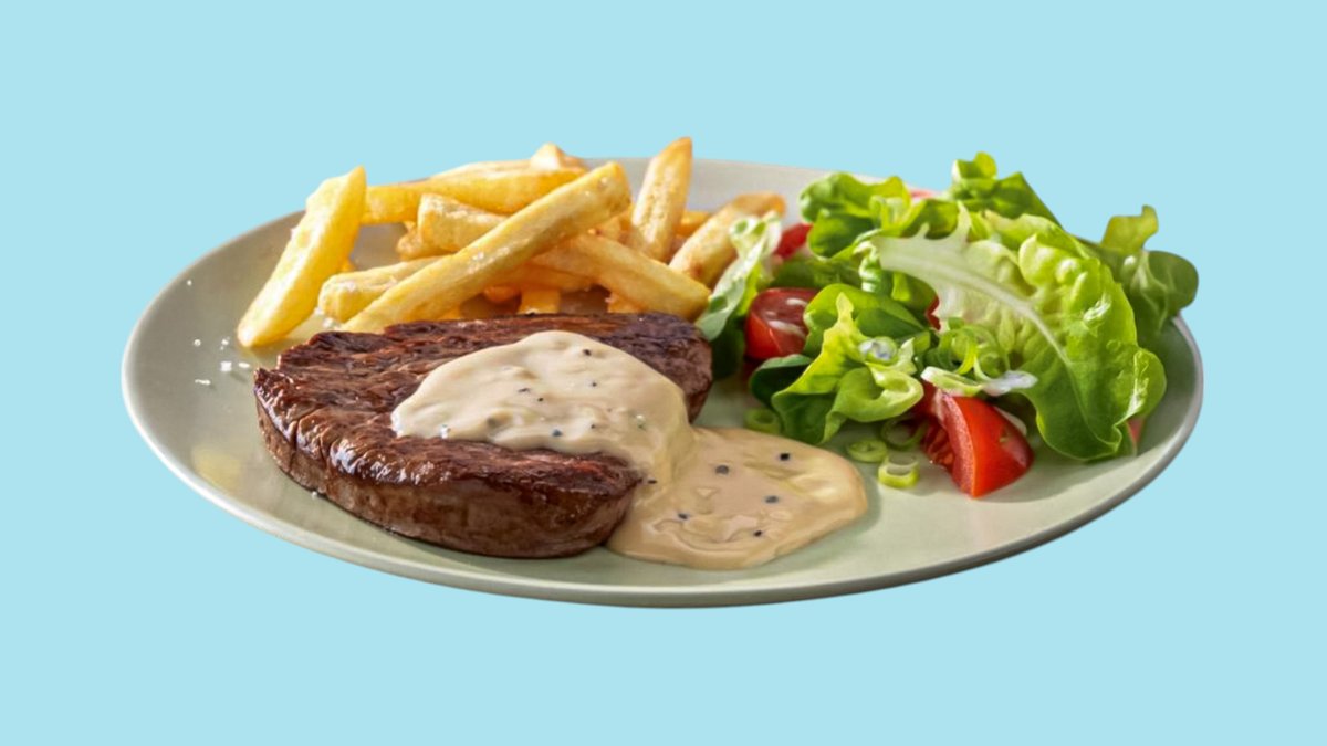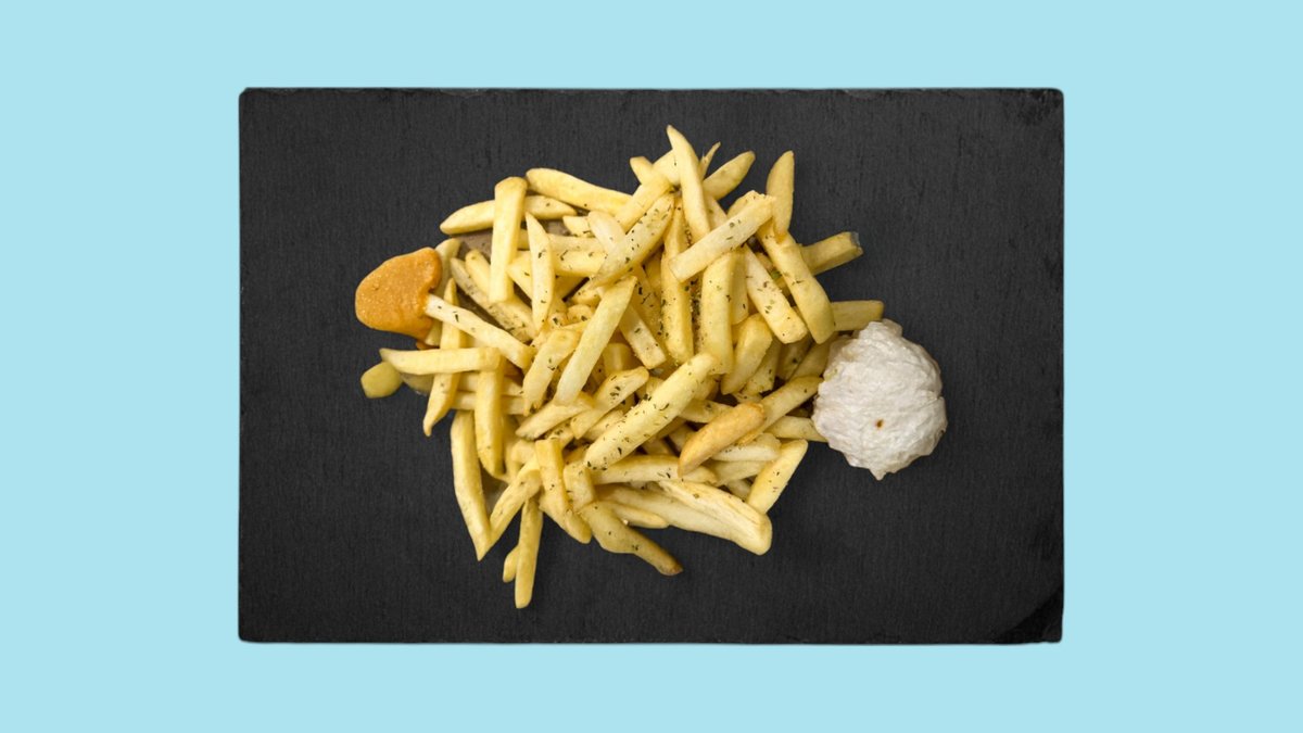 Un demi poulet rôti à la rôtissoire accompagné de crudités et frites