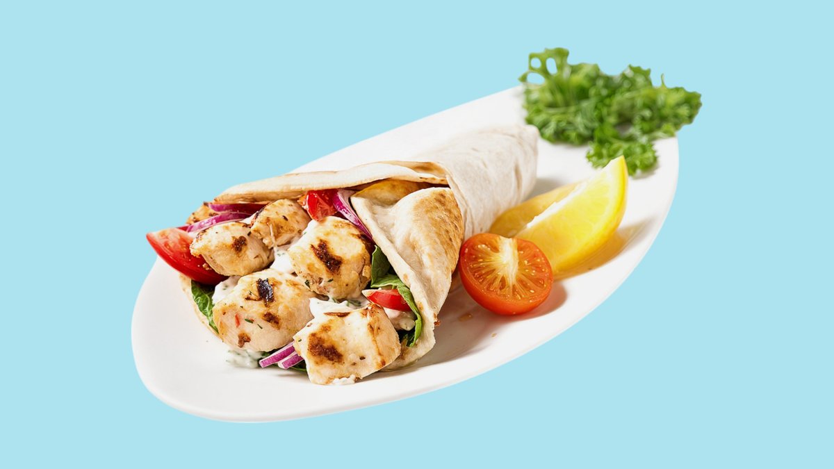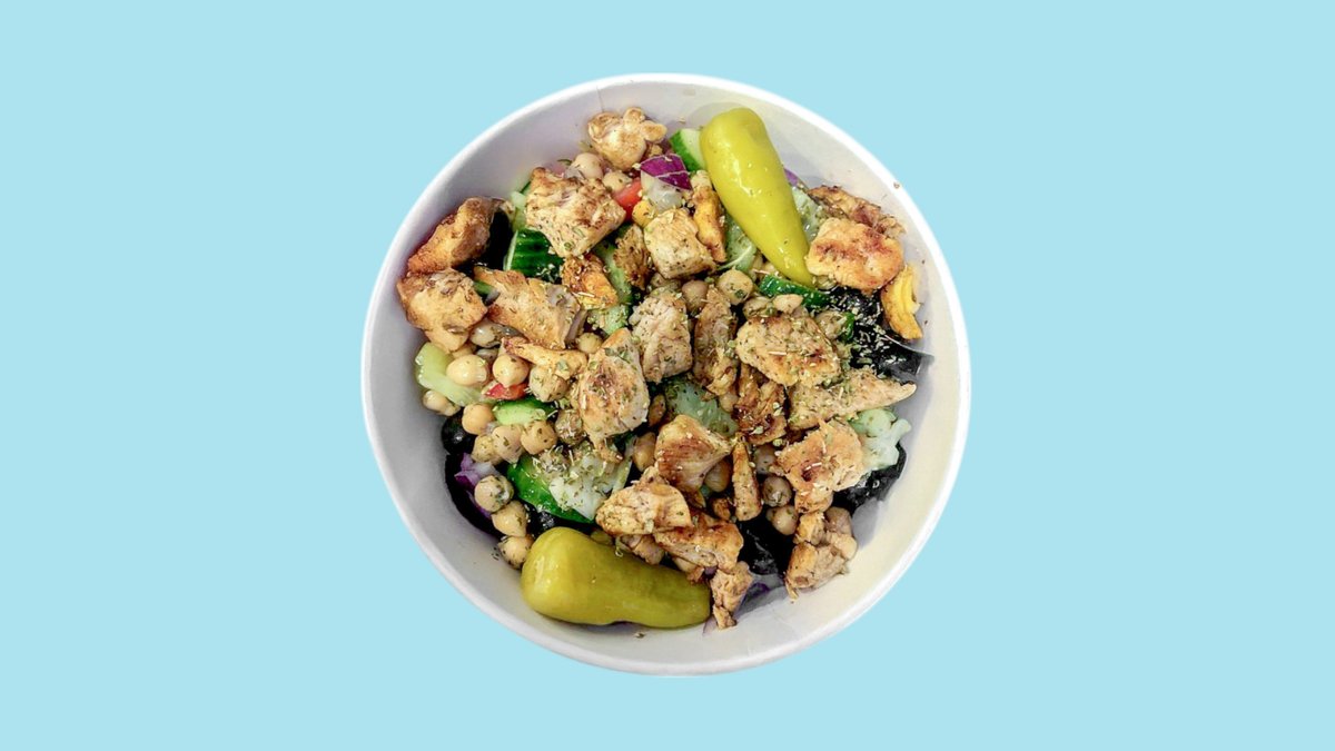 Morceaux de poulet grillé, salade, tomate, olive, concombre, pois chiche