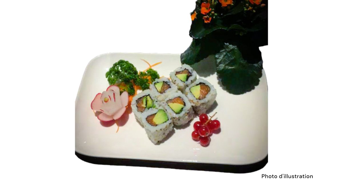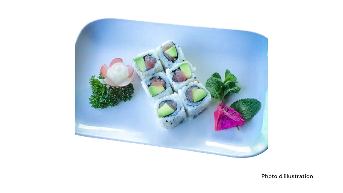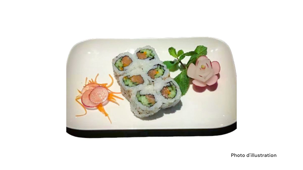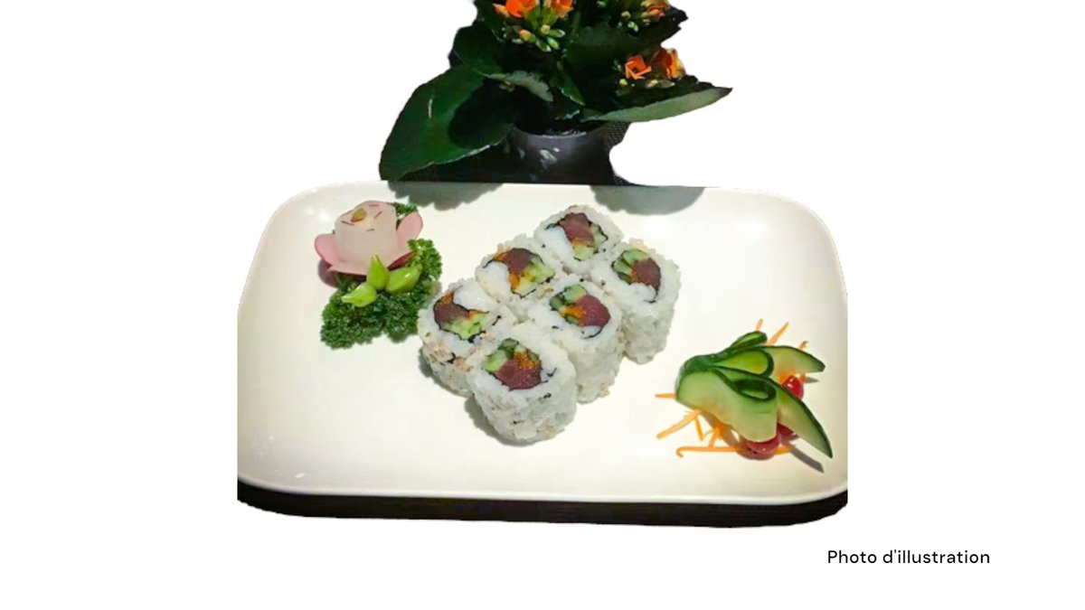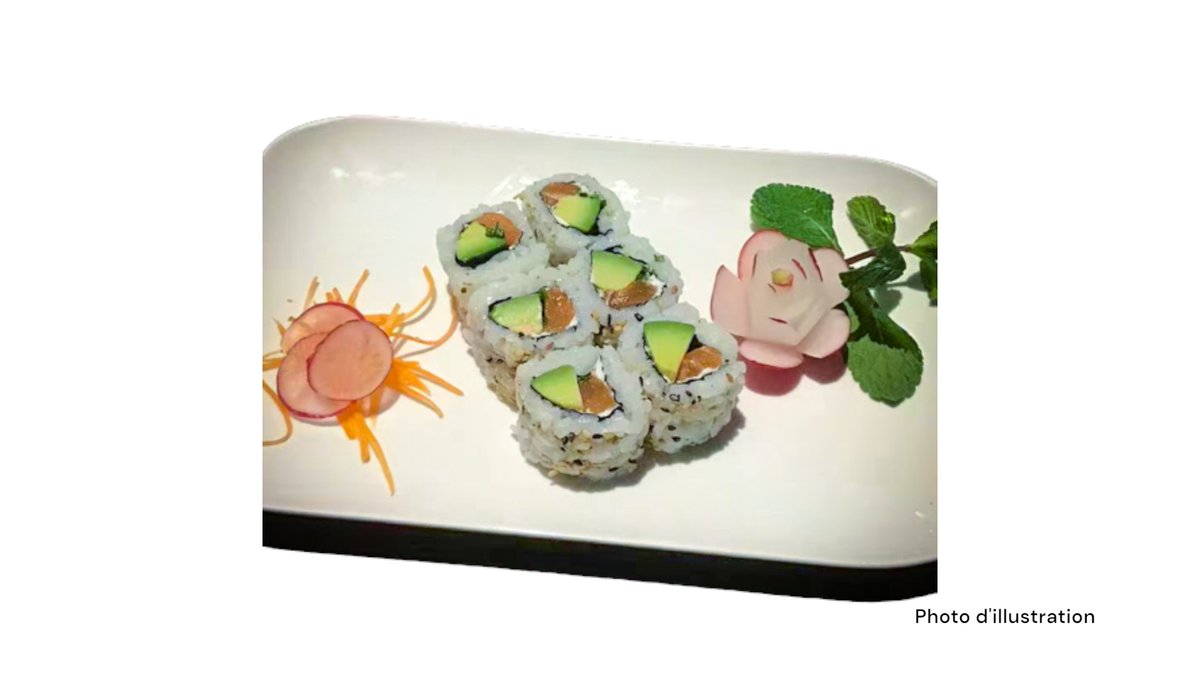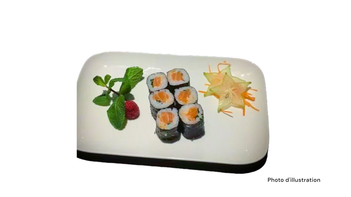 2 Sushi saumon 2 sushi thon 2 sushi saumon mi-cuit 2 sushi thon mi-cuit 5 sashimi saumon 8 california mi-cuit (saumon concombre spicy saumon mi-cuit teriyaki oignon frits)