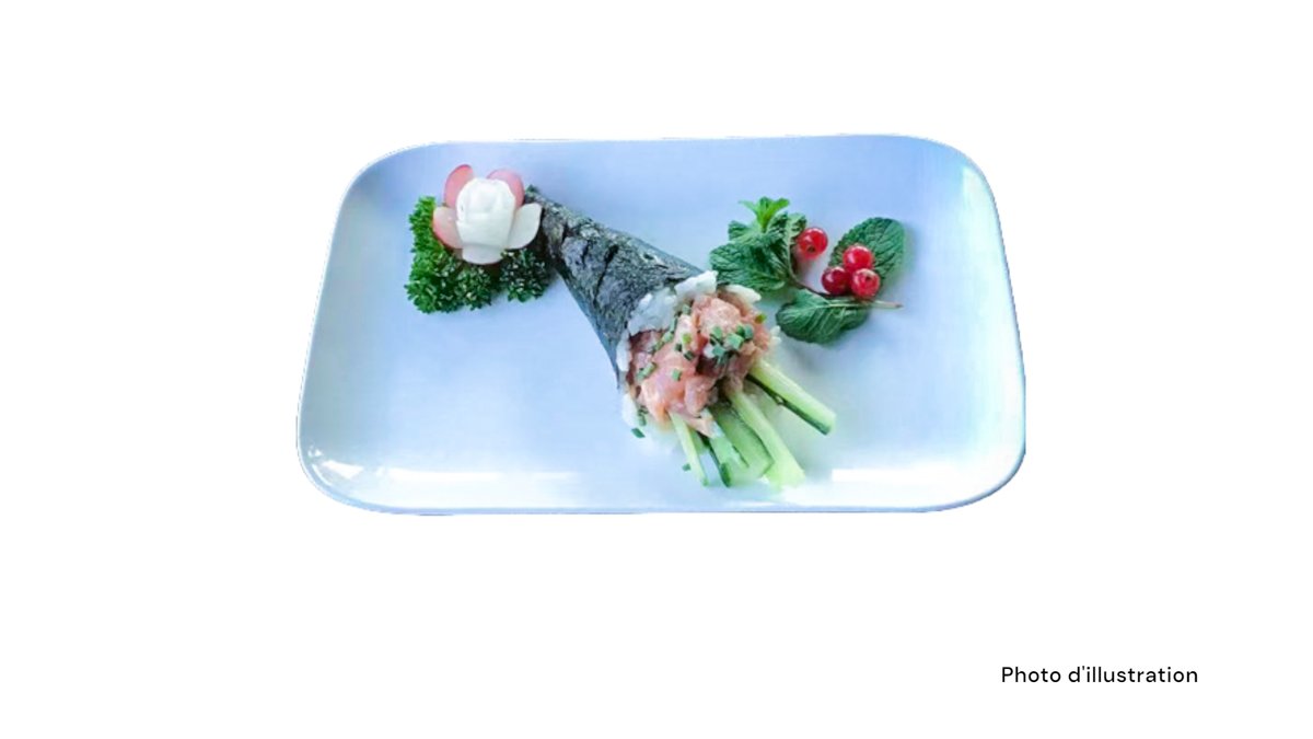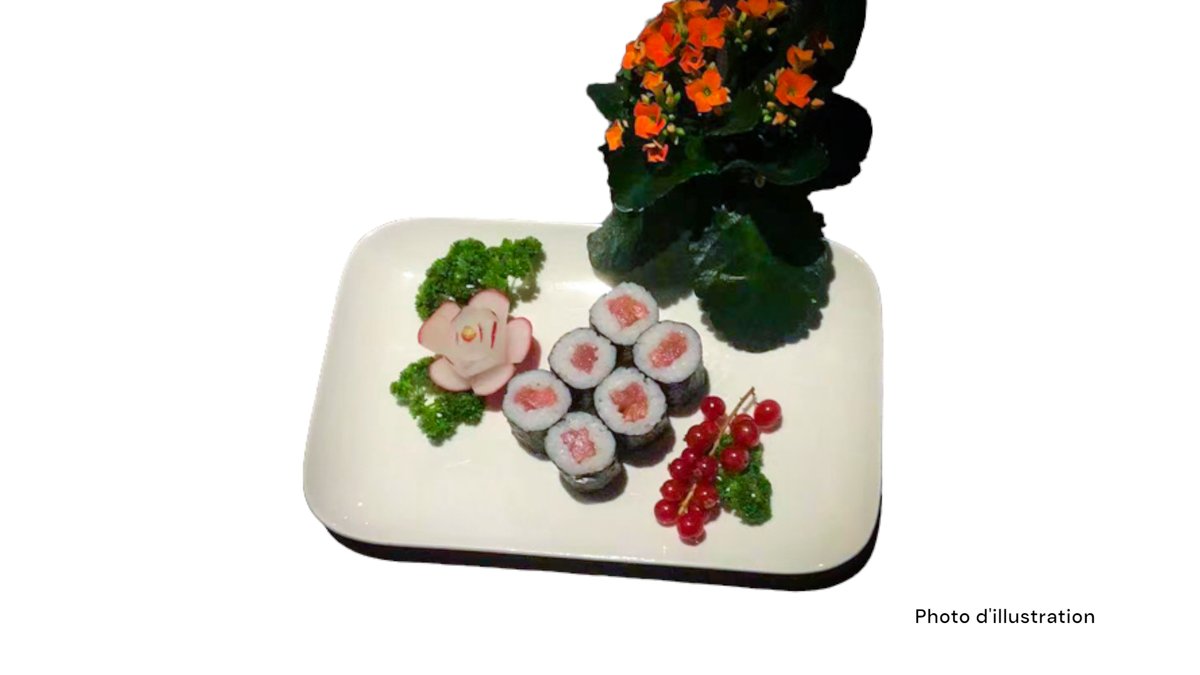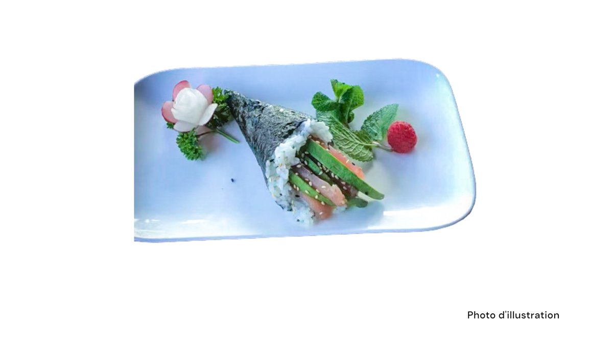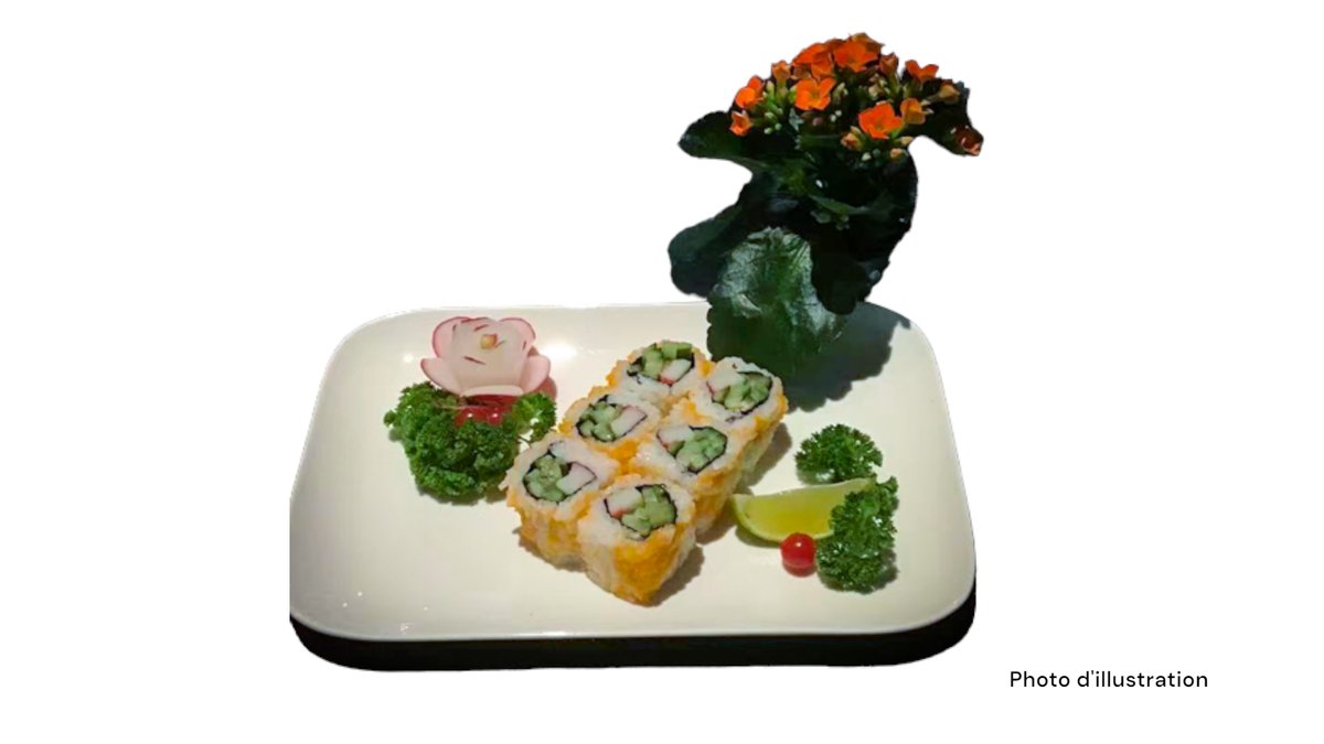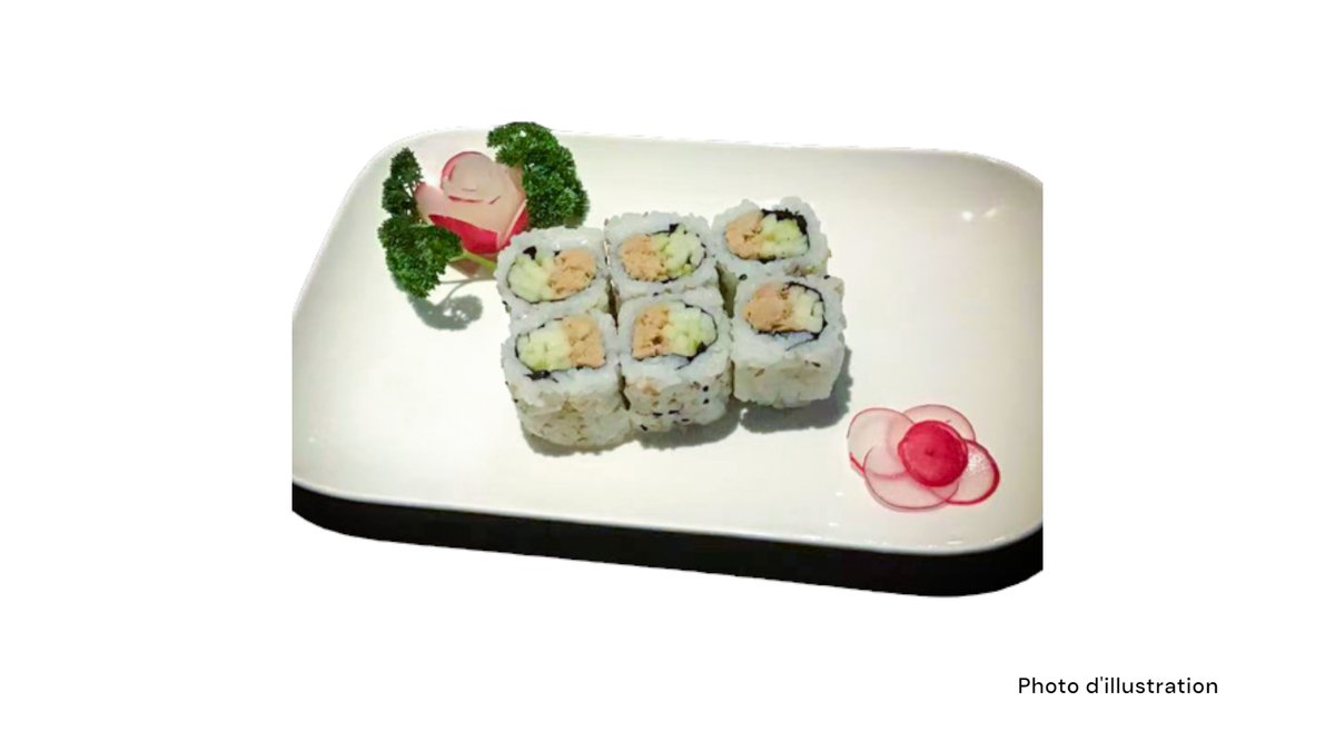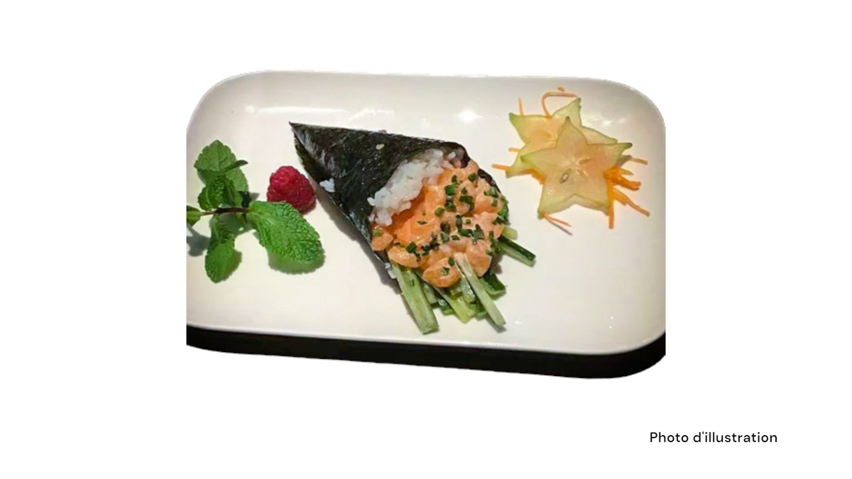 2 Sushi saumon 2 sushi thon 2 sushi saumon mi-cuit 2 sushi thon mi-cuit 5 sashimi saumon 8 california mi-cuit (saumon concombre spicy saumon mi-cuit teriyaki oignon frits)