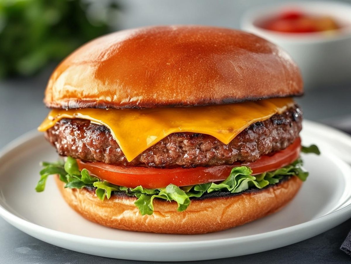 Steak haché juteux, fromage fondant, crudités fraîches et sauce au choix