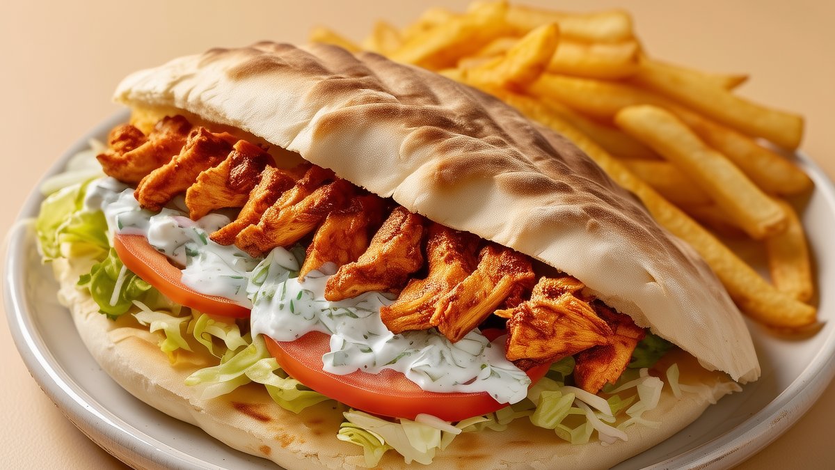 Sandwich kebab savoureux, servi avec frites et boisson au choix.