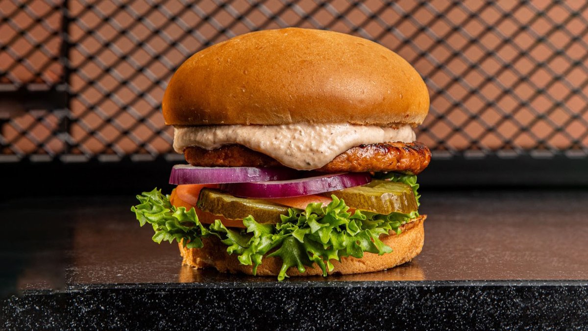 פרגית שמנמנה בציפוי פריך בלחמניית המבורגר, סלטון של חסה ובצל דק, מלפפון חמוץ מתוק, מיו-צ'יפוטלה ורוטב HMB