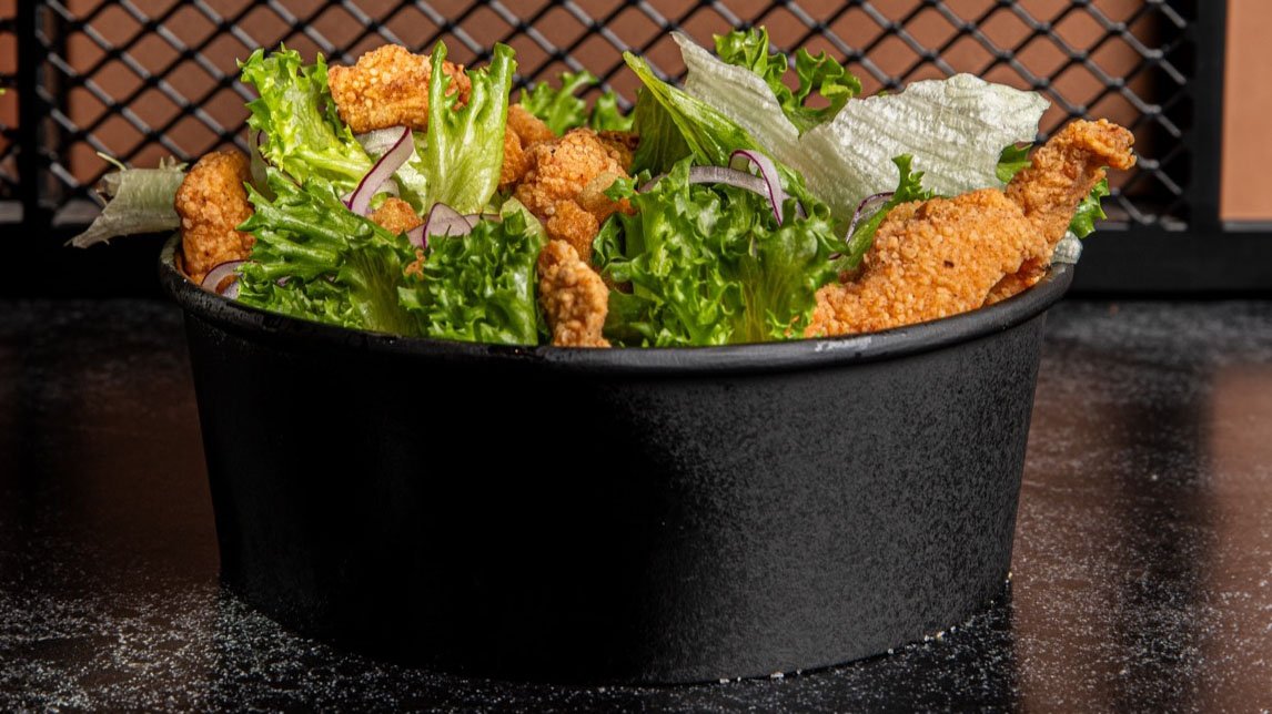 פרגית שמנמנה בציפוי פריך ברוטב חמוץ, מתוק, חריף עם חסה קצוצה, בצל דק, מיו שום מתוק ומלפפון חמוץ מתוק