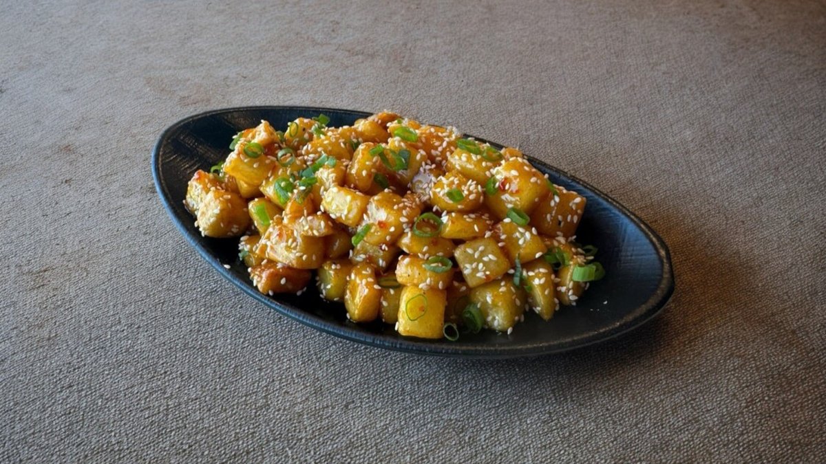 קוביות תפוח אדמה מוקפצות ברוטב צ׳ילי מתוק בליווי שומשום ובצל ירוק