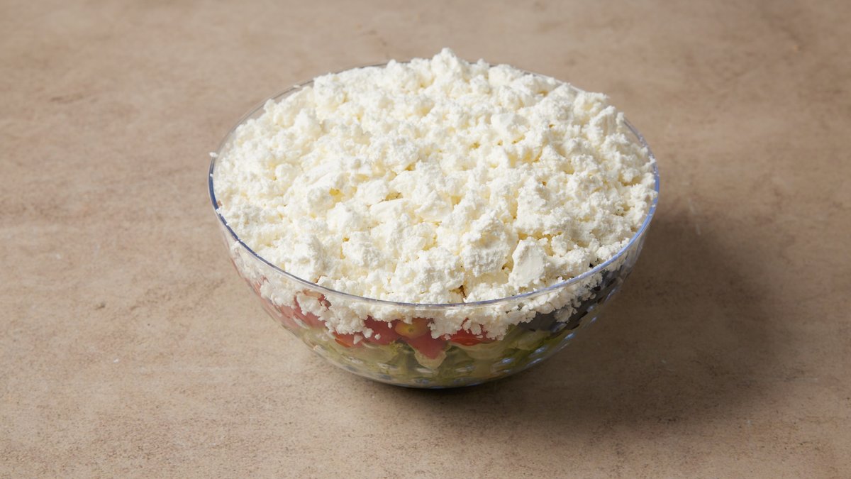 חסה, מלפפון, עגבנייה, בצל, זיתים שחורים וגבינה בולגרית