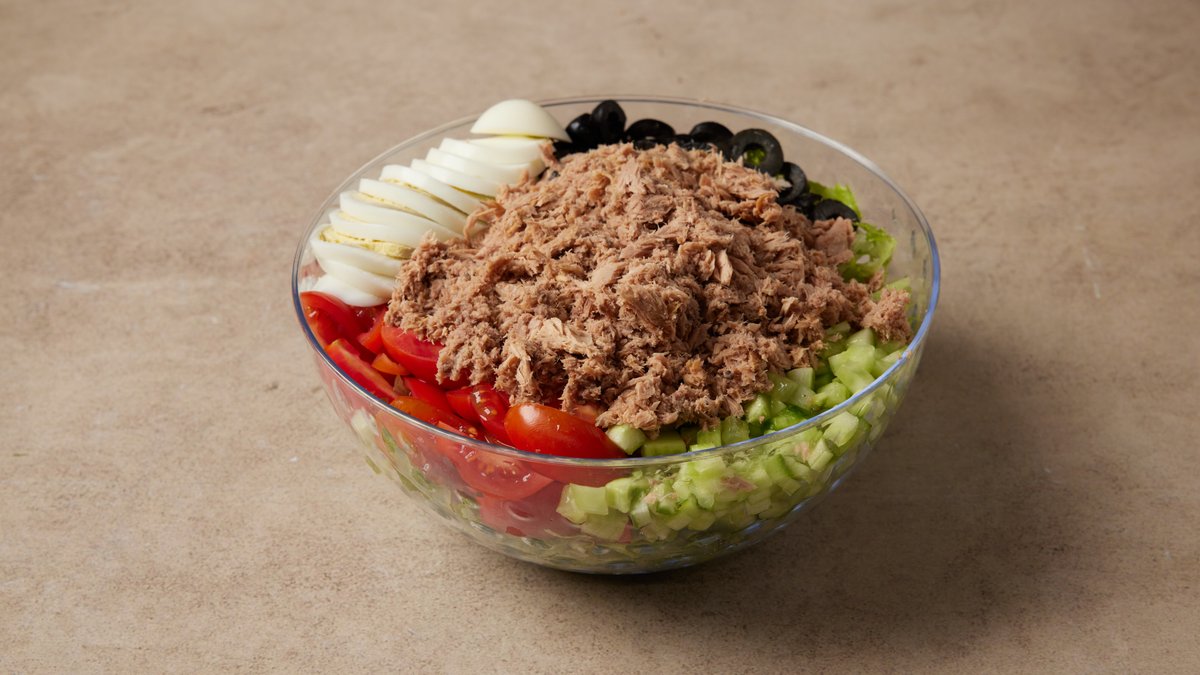 חסה, מלפפון, עגבנייה, בצל, תירס, טונה, ביצה קשה וזיתים