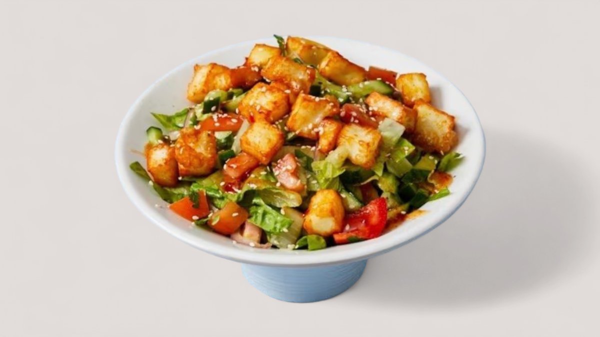 חסה, עגבנייה, מלפפון, בצל, גזר מגורד, וקוביות חלומי מטוגנות, שבריי אגוזי מלך