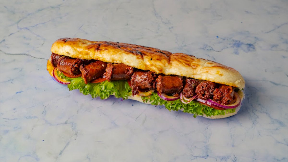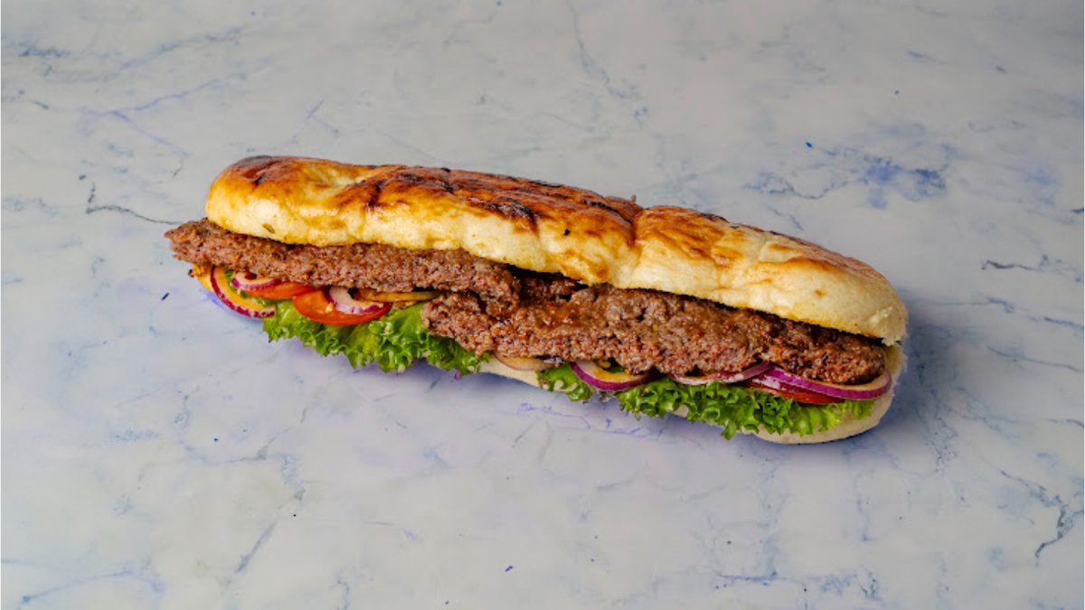 פרנה עם 250 גרם בשר כפול, ממרחים וסלטים לבחירה. מוגש עם צ׳יפס ופחית שתייה