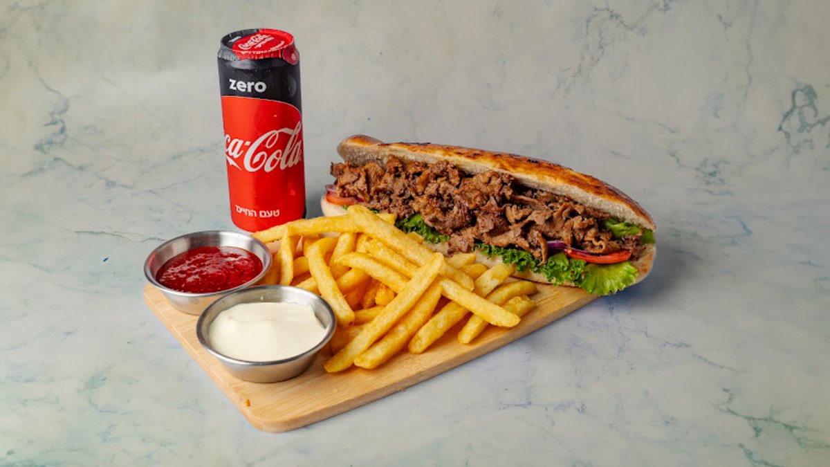 פרנה עם 150 גרם בשר, ממרחים וסלטים לבחירה. מוגש עם צ׳יפס ופחית שתייה
