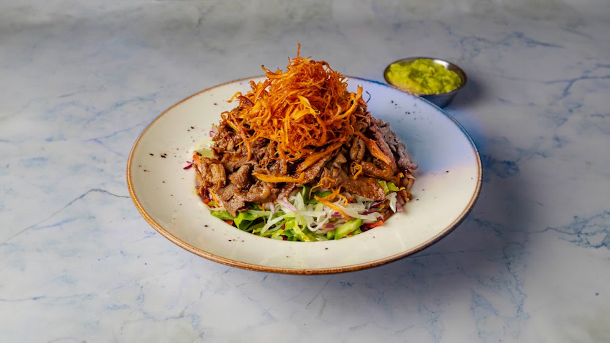 מלפפון, עגבנייה, בצל, חסה, כרוב לבן, פלפל חריף, אבוקדו, גמבה, בטטה קריספי ו300 גרם בשר. ברוטב שמן זית לימון מוגש עם מלח, פלפל וסכו״ם בצד