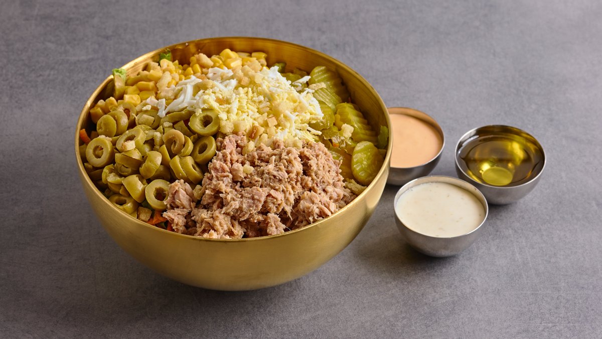 נתחי טונה משובחת, עלי חסה, פרחי עגבנייה, רצועות גזר, טבעות בצל סגול, מלפפונים כבושים, זיתים ירוקים, תירס מתוק, פתיתי ביצה קשה וקרוטונים
