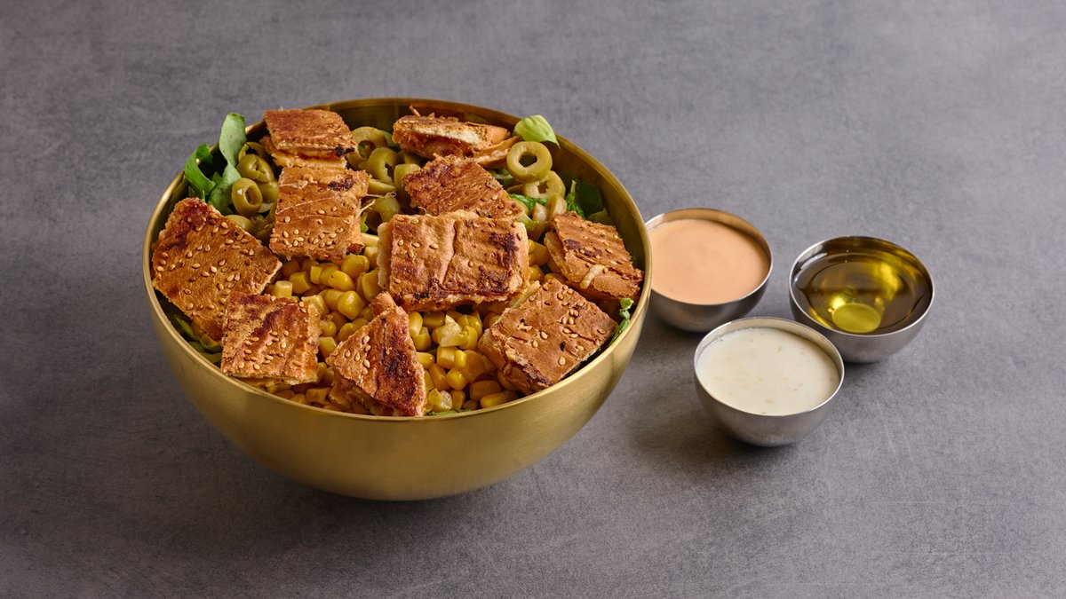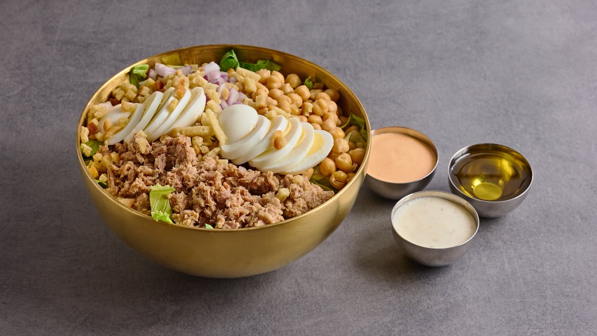 עלי חסה, פלחי עגבניות, מלפפון, גזר, נתחי טונה אטלנטית, דואט ביצים קשות, גרגירי חומוס, טבעות בצל סגול, בזילוף טחינה גולמית וקרוטונים זהובים