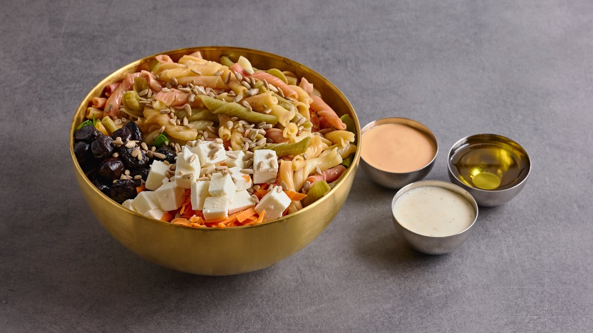 עלי בייבי ועלי חסה, פרוסות עגבנייה, רצועות מלפפון, גזר מתוק עם פסטה מקמח דורום משובח עם זיתי קלמטה יווניים וגרעיני חמנייה קלויים