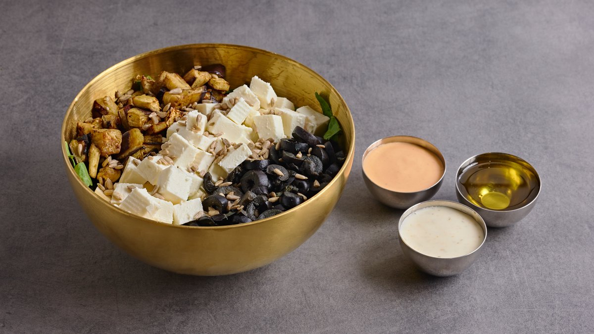 עלי חסה, קוביות עגבנייה, רצועות מלפפון, גזר פרוס דק, רצועות גמבה, זיתים שחורים, חציל קלוי, עם גבינת פטה מגורדת וגרעיני חמנייה קלויים