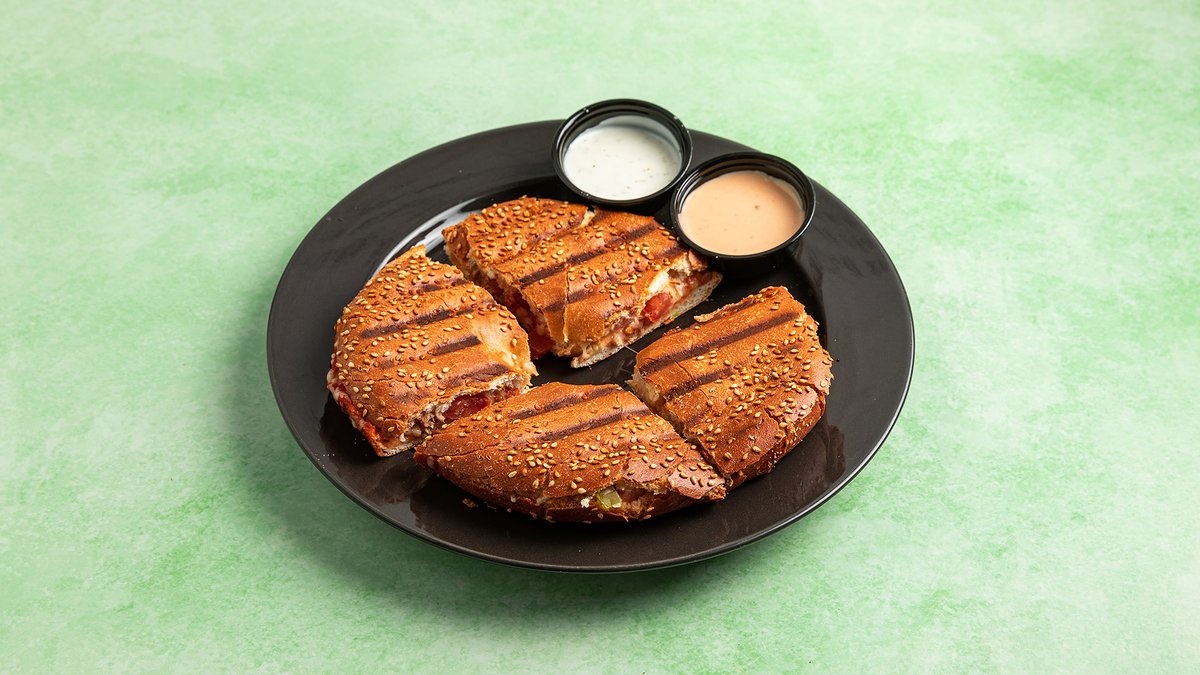 ממרח פסטו, גבינת פטה, מוצרלה, חציל קלוי, פלפל קלוי,זיתים שחורים ובצל סגול וזעתר בלחם לבחירה