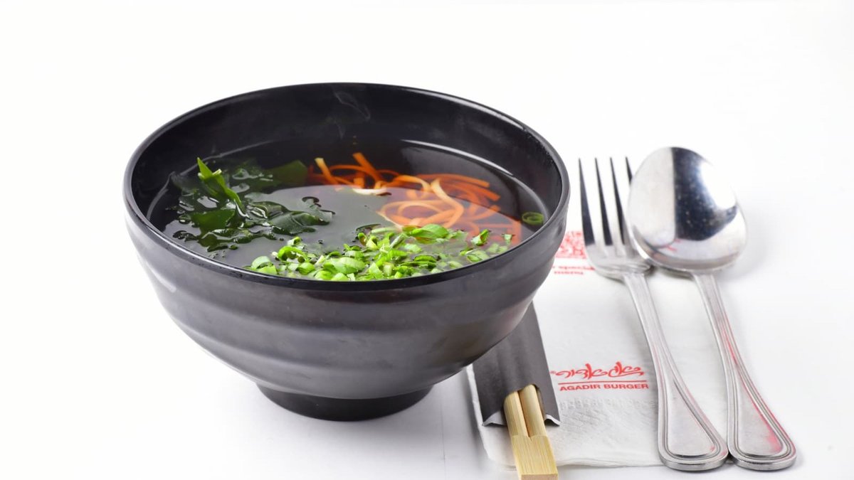 איטריות אודון על בסיס מרק דאשי סויה ומירין מוגש עם אצות וואקאמה ובצל ירוק