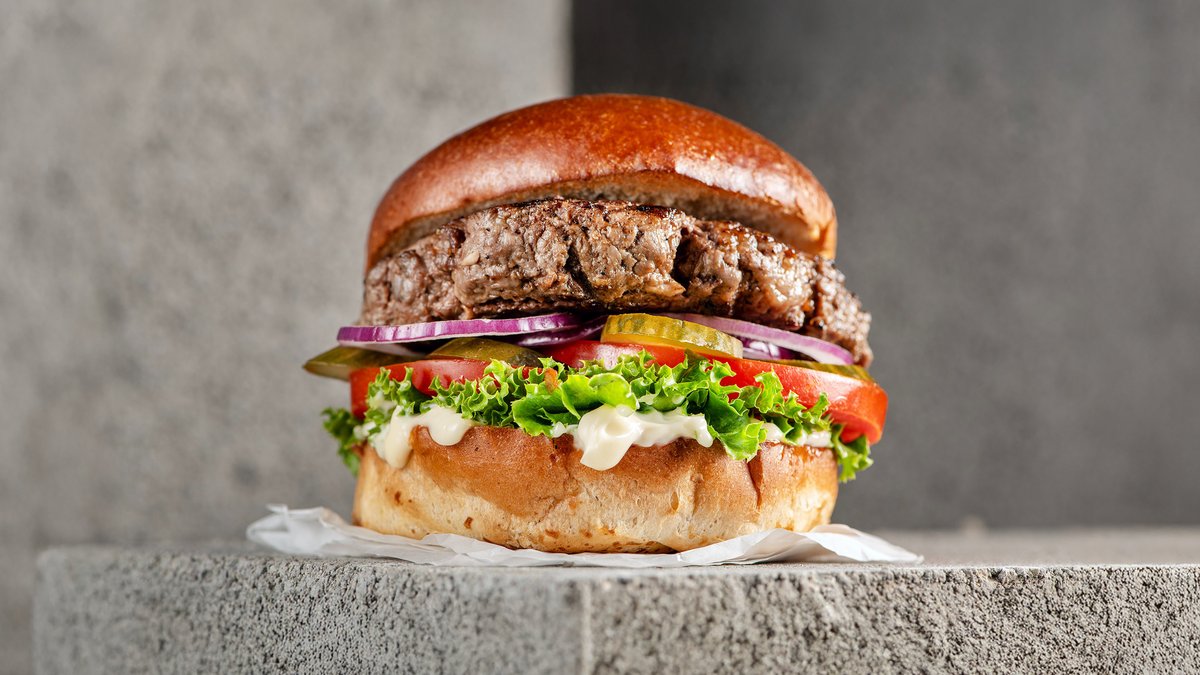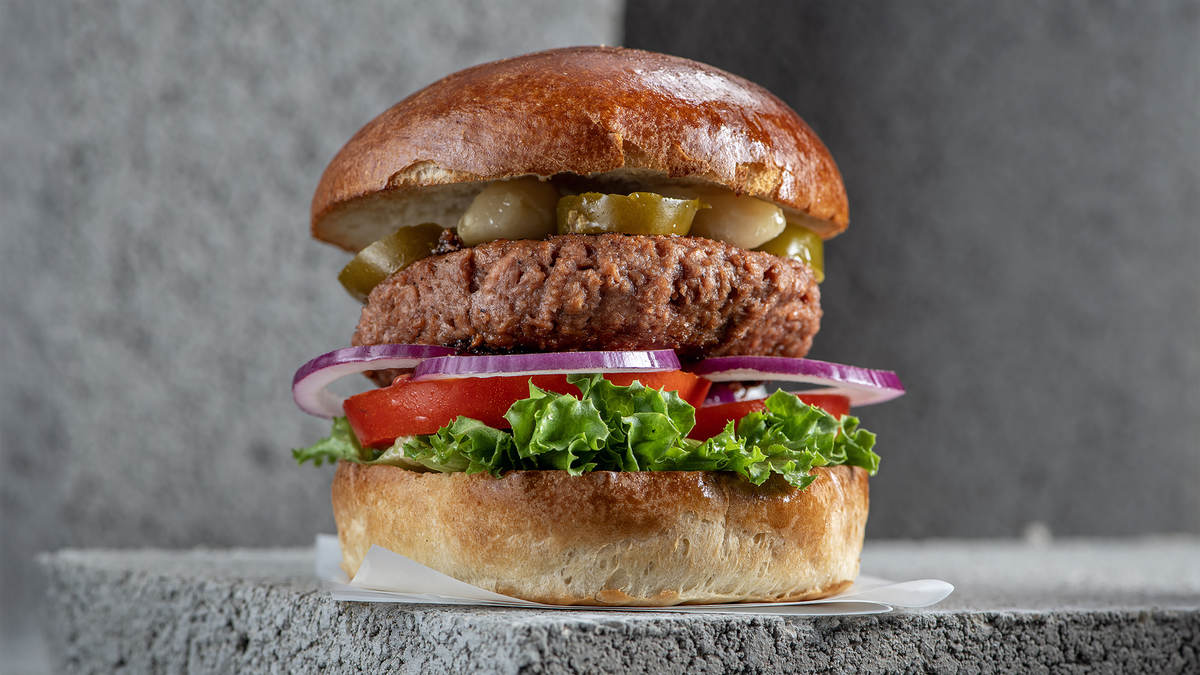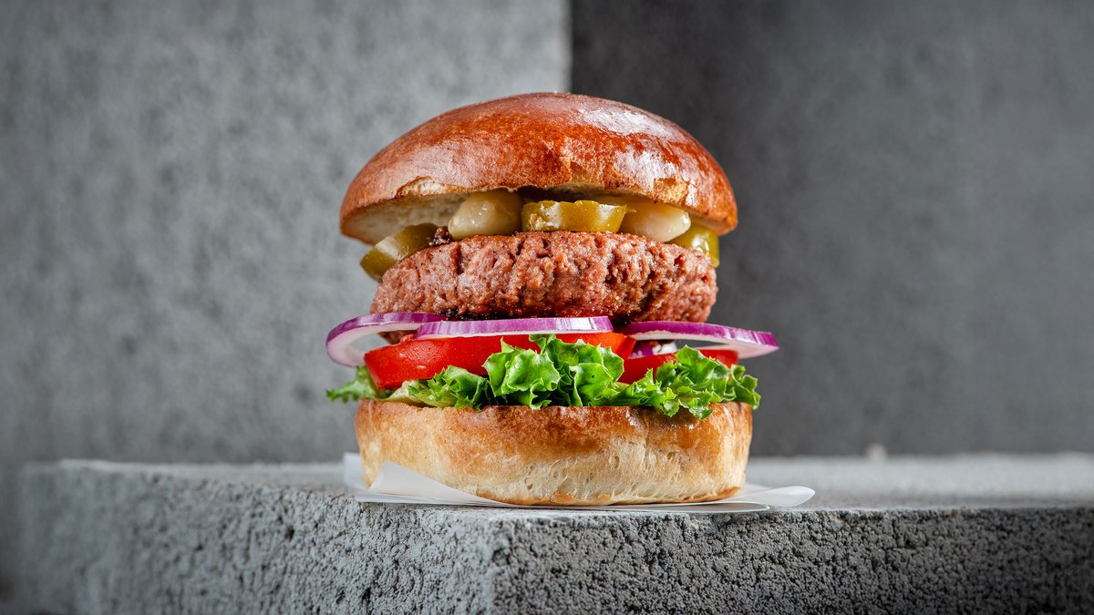 המבורגר רידיפיין טבעוני מוגש עם מיונז, חסה עגבניה מלפפון חמוץ ובצל