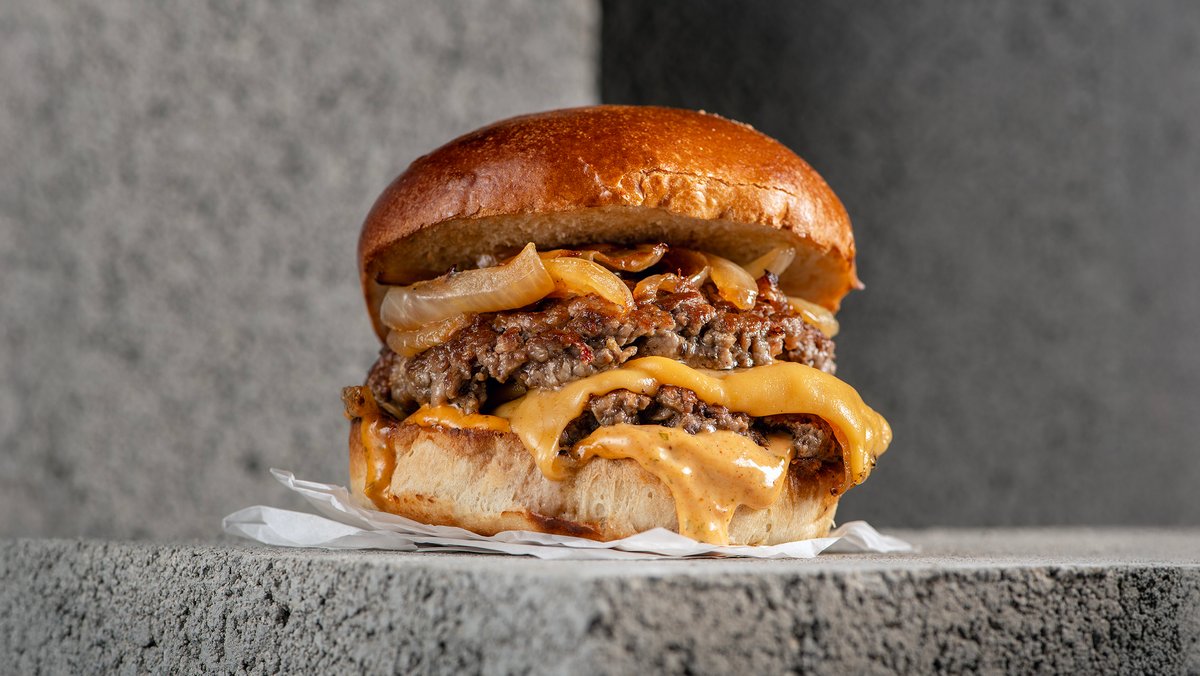 2 קציצות 110 גרם כל אחת, בלחמניה עם בצל מקורמל, רוטב הבית, גבינת צ׳דר טבעונית וחלפניו
