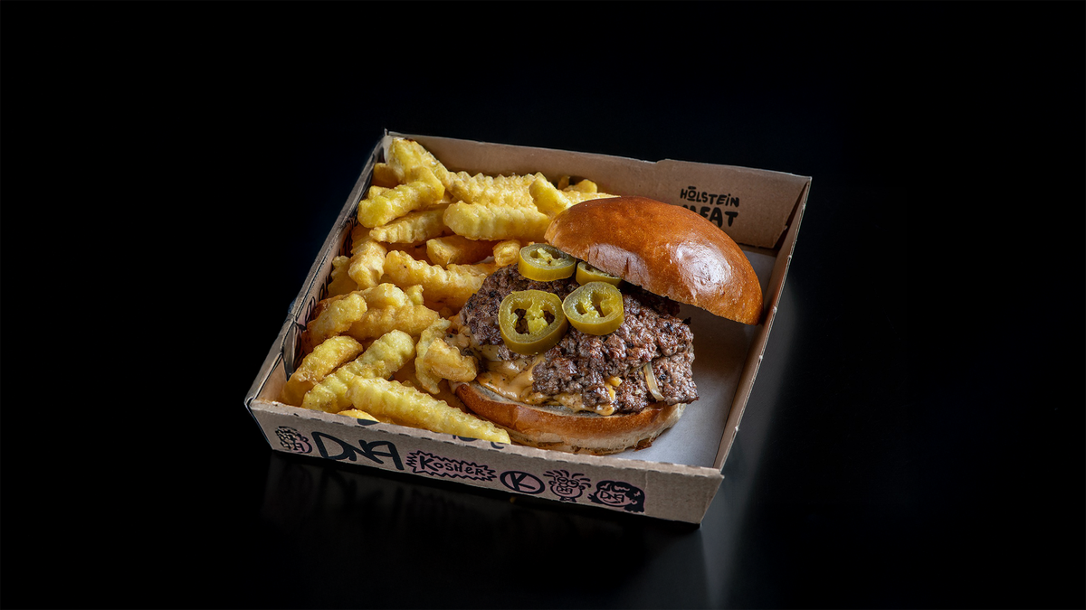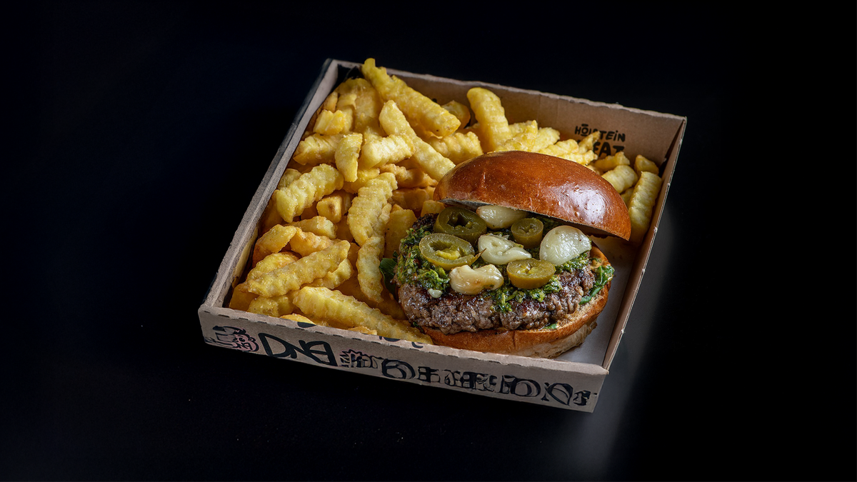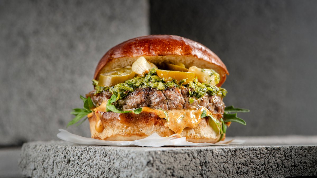 המבורגר 220 גרם 100% בקר טרי שנטחן במקום, בלחמניה עם ספייסי מיונז, עלי רוקט, חלפיניו, צ'ימיצורי ושום קונפי | מוגש עם צ׳יפס בלגי