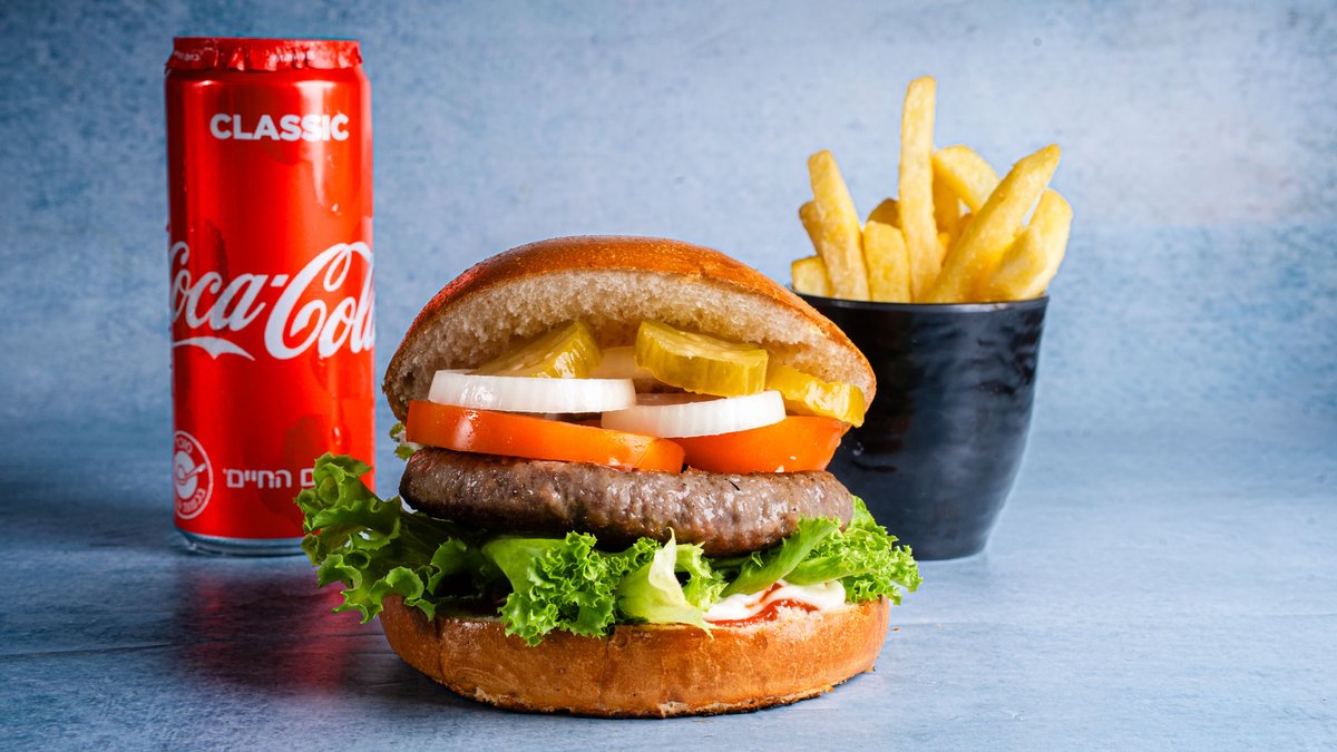 המבורגר 160 גרם עם חסה, עגבניה, בצל ומלפפון חמוץ מוגש עם 2 תוספות בצד, צ׳יפס קטן ושתיה לבחירה