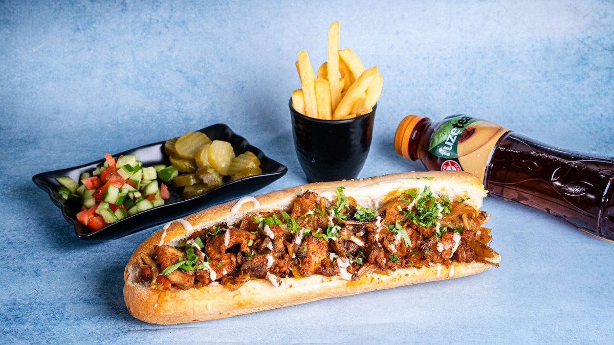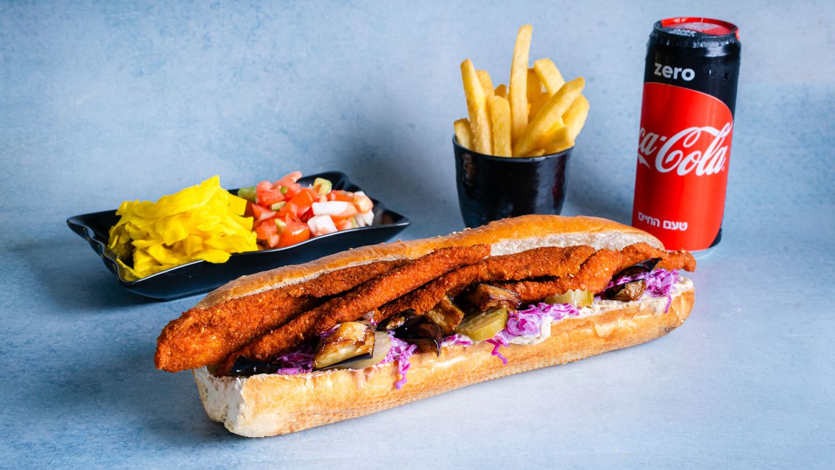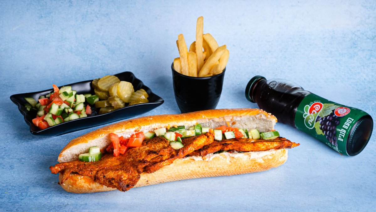 בחרו צורת הגשה, סלטים וממרחים מוגש עם 2 תוספות בצד, צ׳יפס קטן ושתיה לבחירה