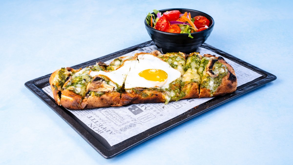 רוטב פסטו, מוצרלה, פטריות וביצת עין על מאפה גירוס