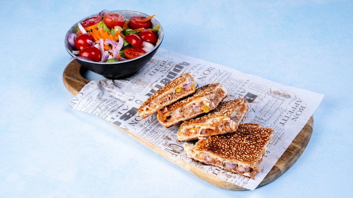 חסה, מלפפון, עגבניה, גבינת פטה, זיתי קלמטה, בצל סגול, שמן זית וזעתר | מוגש עם שני רטבים לבחירה
