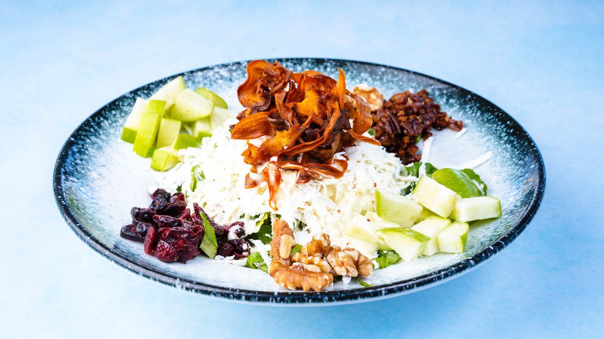 חסה, תפוח ירוק, אגוזי מלך ופקאן, צימוקים, גבינת עיזים מגורדת, קריספי בטטה דק דק ורוטב ויניגרט | מוגש עם שני רטבים לבחירה