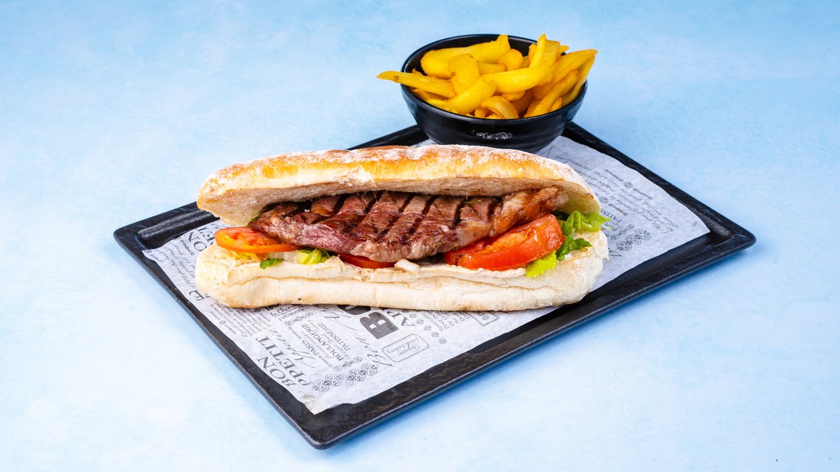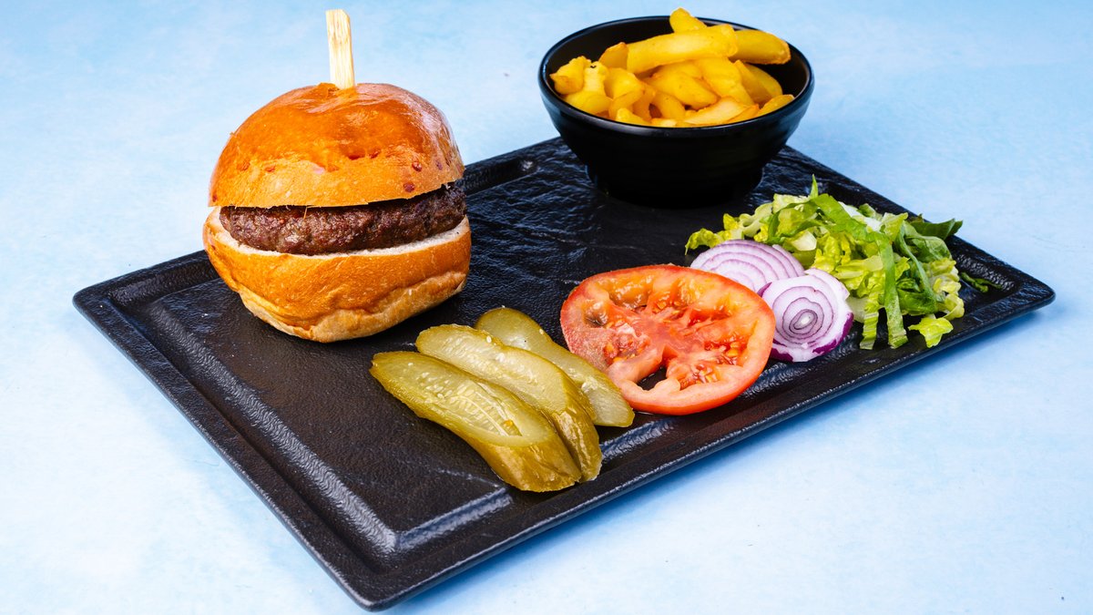 לחמניית בריוש שחורה, קציצת 200 גרם, רצועות פילה בקר, חסה, עגבנייה, בצל ומלפפון חמוץ | מוגש עם צ׳יפס