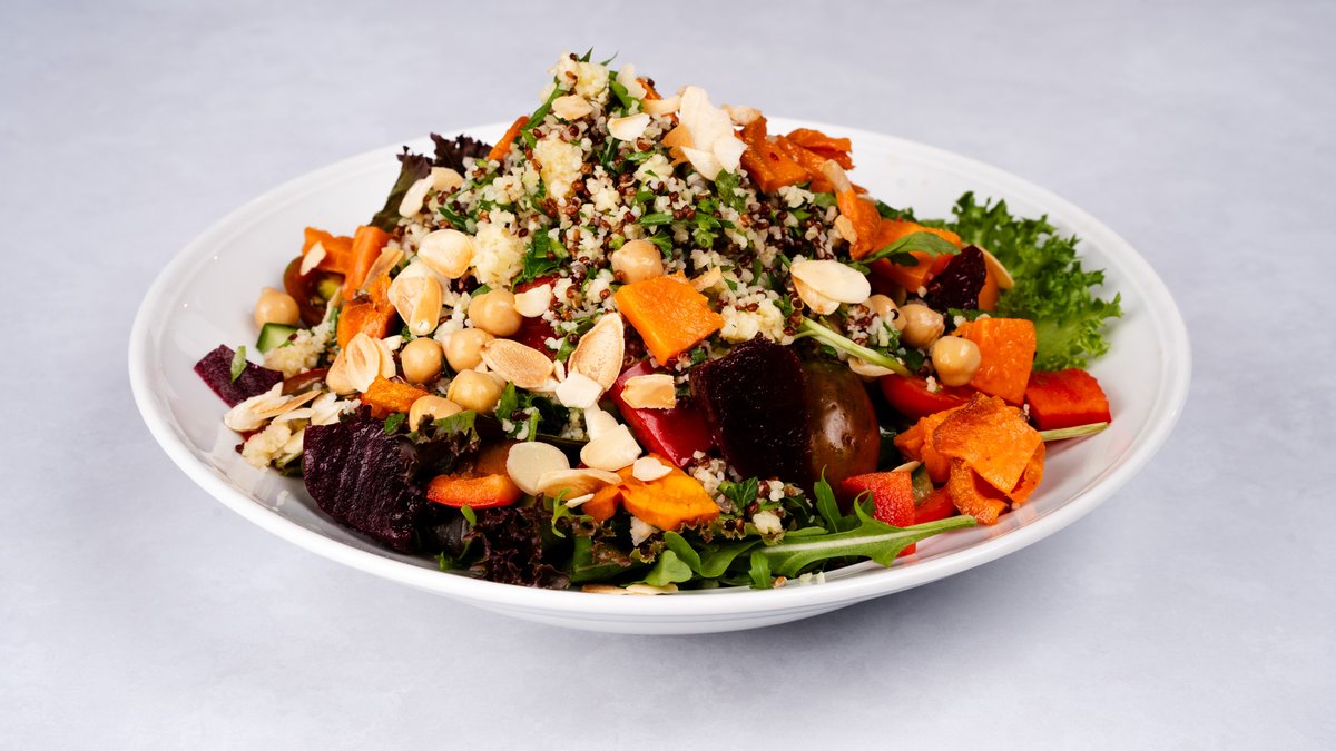 חסה, מלפפון, פלפלים, עגבניות שרי, סלק צלוי, בורגול, קינואה, שקדים קלויים וטחינה גולמית בשמן זית ולימון