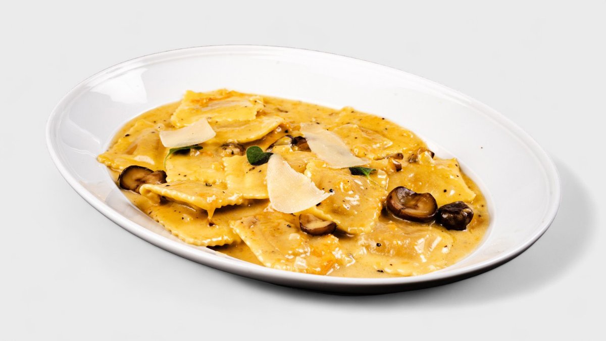 רביולי ממולא בטטה וגבינת ריקוטה בקרם בטטה וערמונים