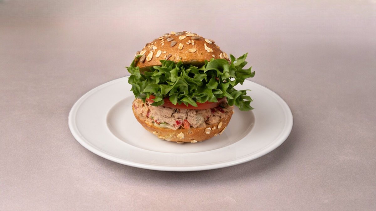 סלט טונה עם מיונז, לימון כבוש ופלפלים, עגבנייה, חסה ומלפפון חמוץ בלחם שיפון