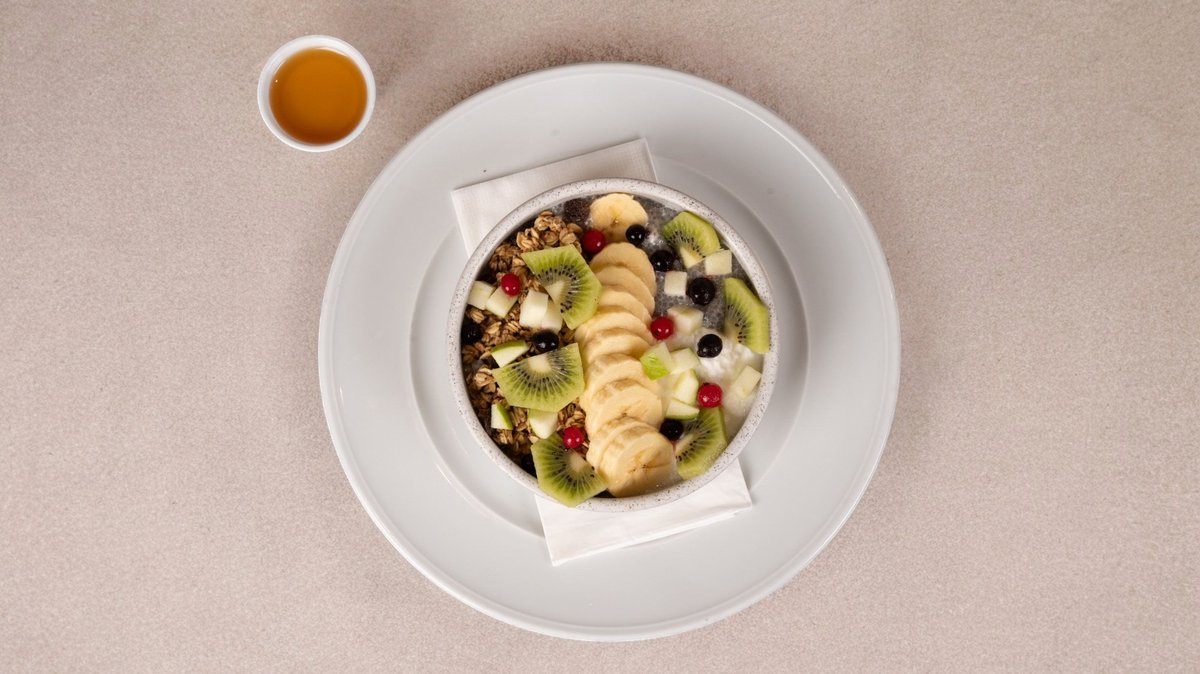 יוגורט, פודינג צ׳יה, פירות העונה, דבש וסילאן